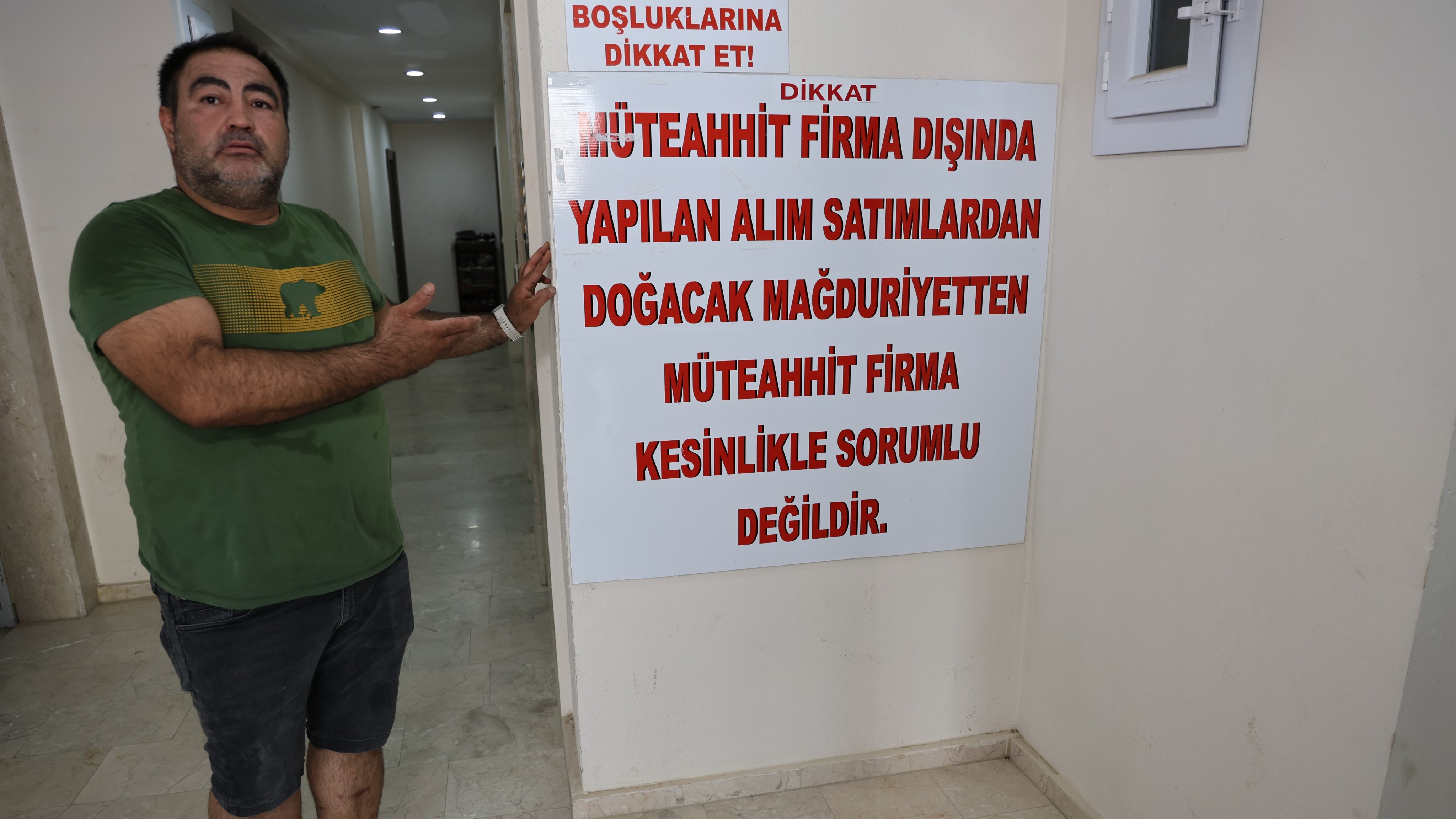 Adana'da dolandırıldığını öne süren müteahhit, binasının girişine 'Firma dışında yapılan alım satımlardan doğacak mağduriyetten müteahhit firma kesinlikle sorumlu değildir' yazısı astı. Daireyi satın alan H.K. ise kimseyi dolandırmadığını, para verip daireyi satın aldığını ancak evine bir türlü oturamadığını, bu konuyla ilgili müteahhit ile mahkemelik olduğunu söyledi.