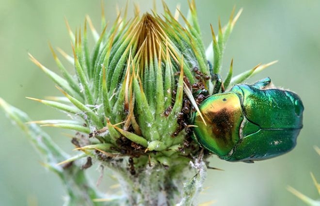 Halk arasında gül böceği olarak da bilinen altın böcekleri, Iğdır'da doğada beslenirken görüntülendi. Altın böceğinin çıkardığı nektarın kokusunu alan karıncalar paylarına düşeni almak için kıyasıya mücadele verdiler.