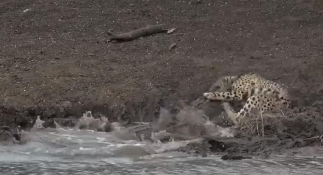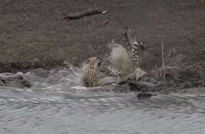 Çita su içerken, timsah bir anda ortaya çıktı ve tek hamleyle çitayı suya sürükledi.