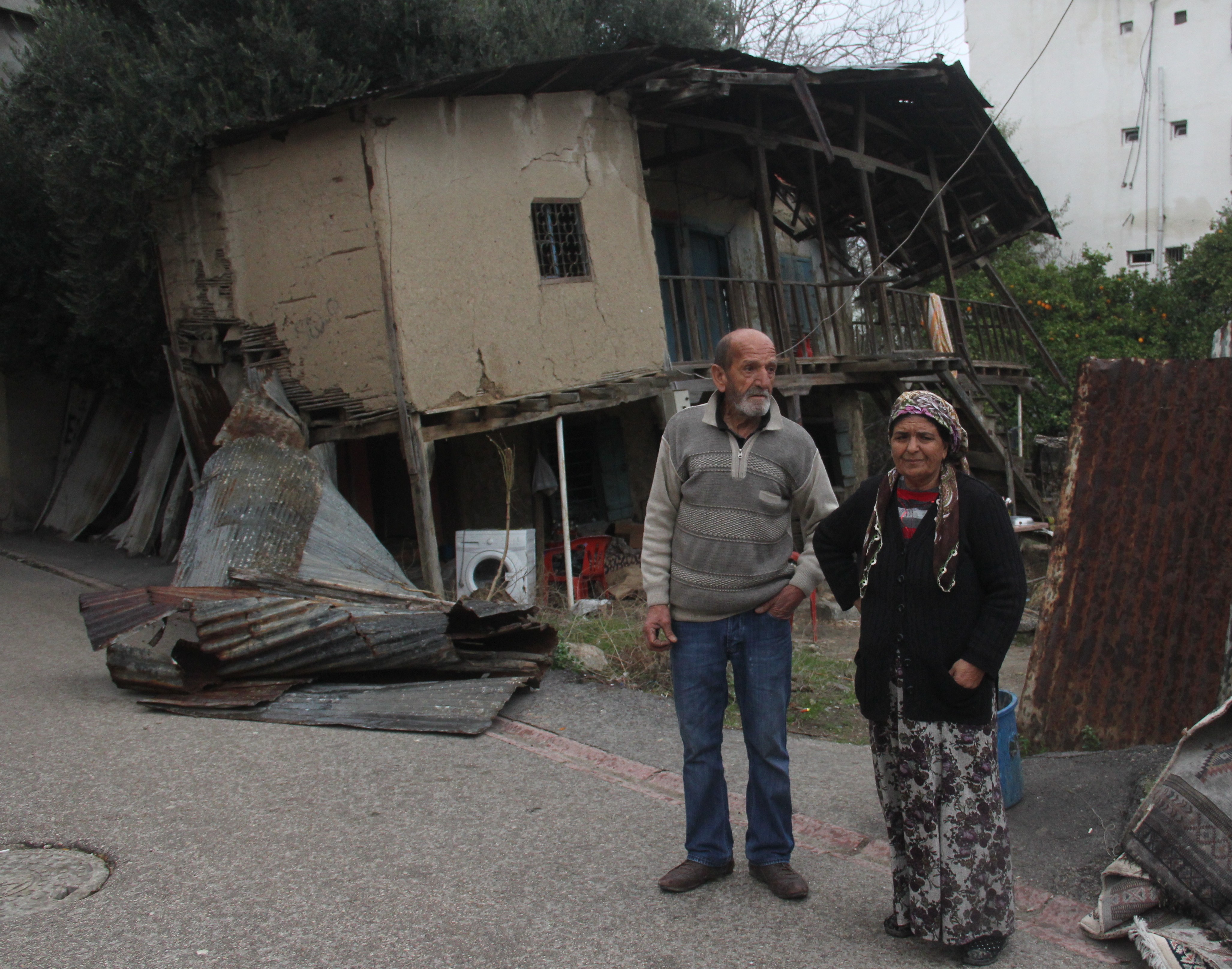 Gidecek yerleri olmayan çift burada yaşamaya devam etti. Dün de yağan yağmur ve rüzgar nedeniyle ev biraz daha hasar görünce komşular yaşlı çiftin canları pahasına evde kalmasına razı olmadı.