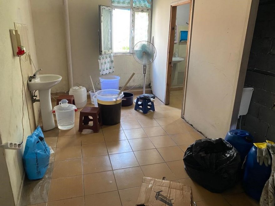 Dikenli tellerden tırmanarak boş arazide koşan şüpheliler, polisin takibiyle yakalandı. Depoda arama yapan ekipler, 205 litre sıvı metamfetamin, 62 litre asetik anhidrit ve 75 litre ara kimyasal maddeler ele geçirdi.