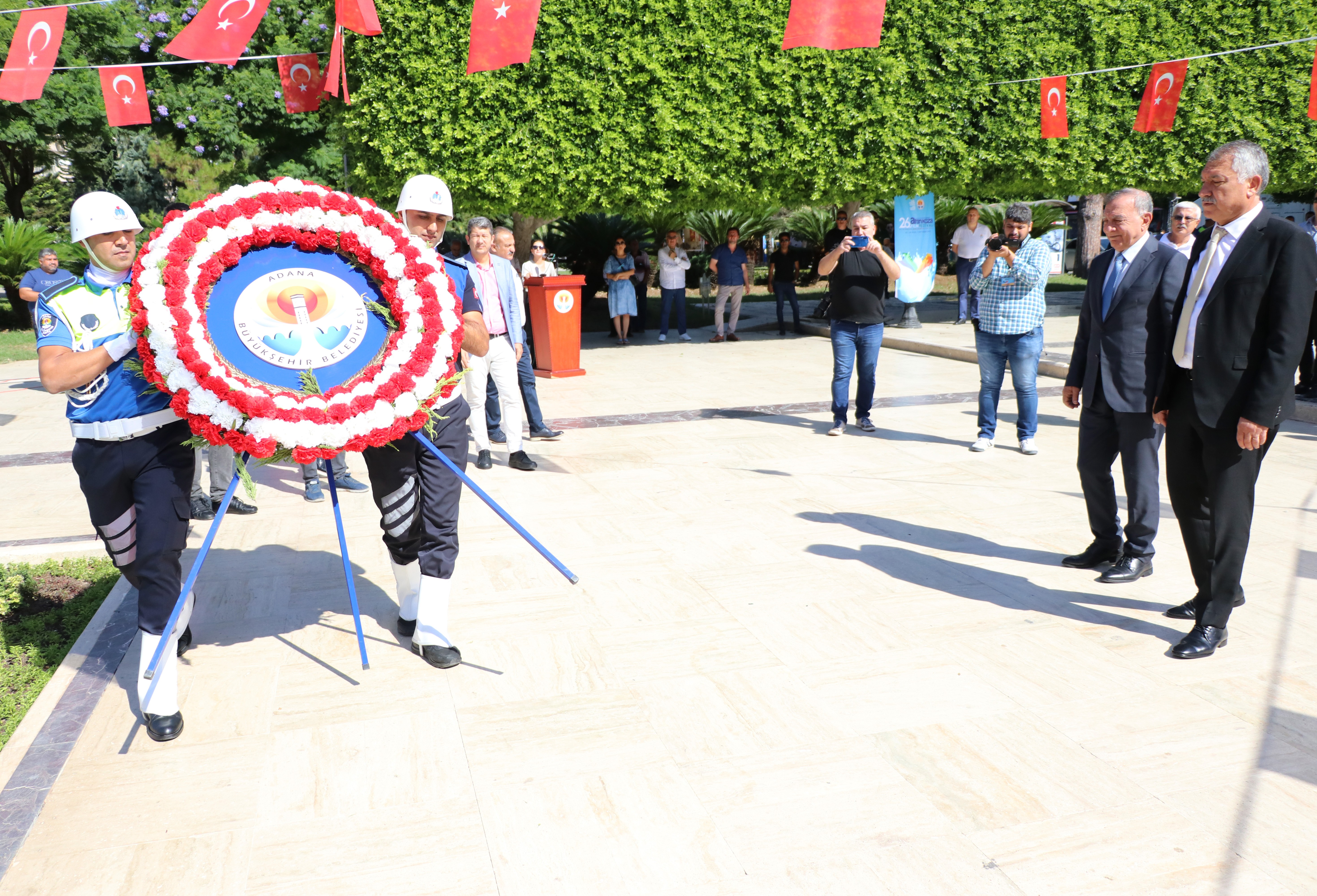 Atatürk Parkı’nda düzenlenen çelenk töreni saygı duruşu ve İstiklal Marşı’nın okunmasıyla başladı. Daha sonra Adana Büyükşehir Belediye Başkanı Zeydan Karalar ve Seyhan Belediye Başkanı Akif Kemal Akay, Atatürk Anıtı’na Adana Büyükşehir Belediyesi çelengi koydu. CHP Adana Milletvekili Müzeyyen Şevkin ve Altın Koza Film Festivali Yönetim Kurulu Başkanı Menderes Samancılar ise anıta Altın Koza Film Festivali çelengi bıraktı.