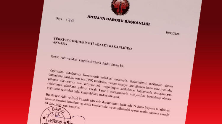 ADALET Bakanlığı'na ortak dilekçe ile başvuran 74 ilin baro başkanı, koronavirüs salgını nedeniyle, adli ve idari yargıda tüm sürelerin durdurulması talebinde bulundu.