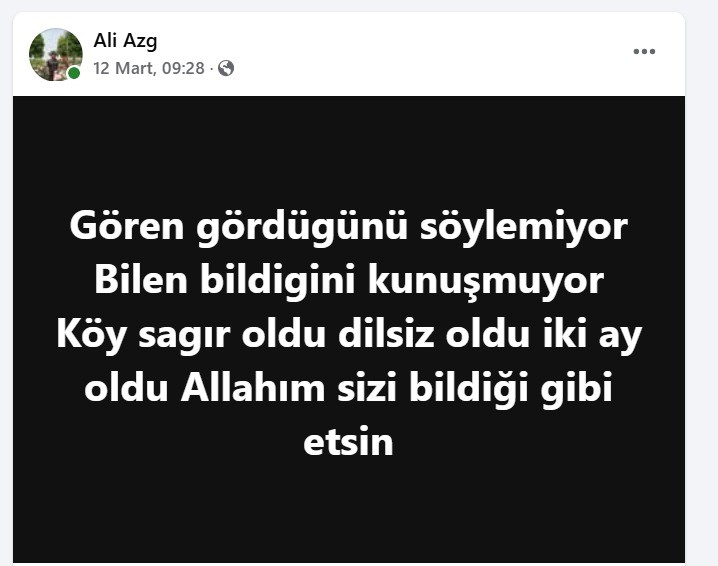 Sosyal medya hesabından paylaşımda bulunan baba Ali Azgın," Gören gördüğünü söylemiyor, bilen bildiğini konuşmuyor köy sağır, dilsiz oldu. İki ay oldu. Allah'ım sizi bildiği gibi etsin" diyerek tepkisini dile getirdi.