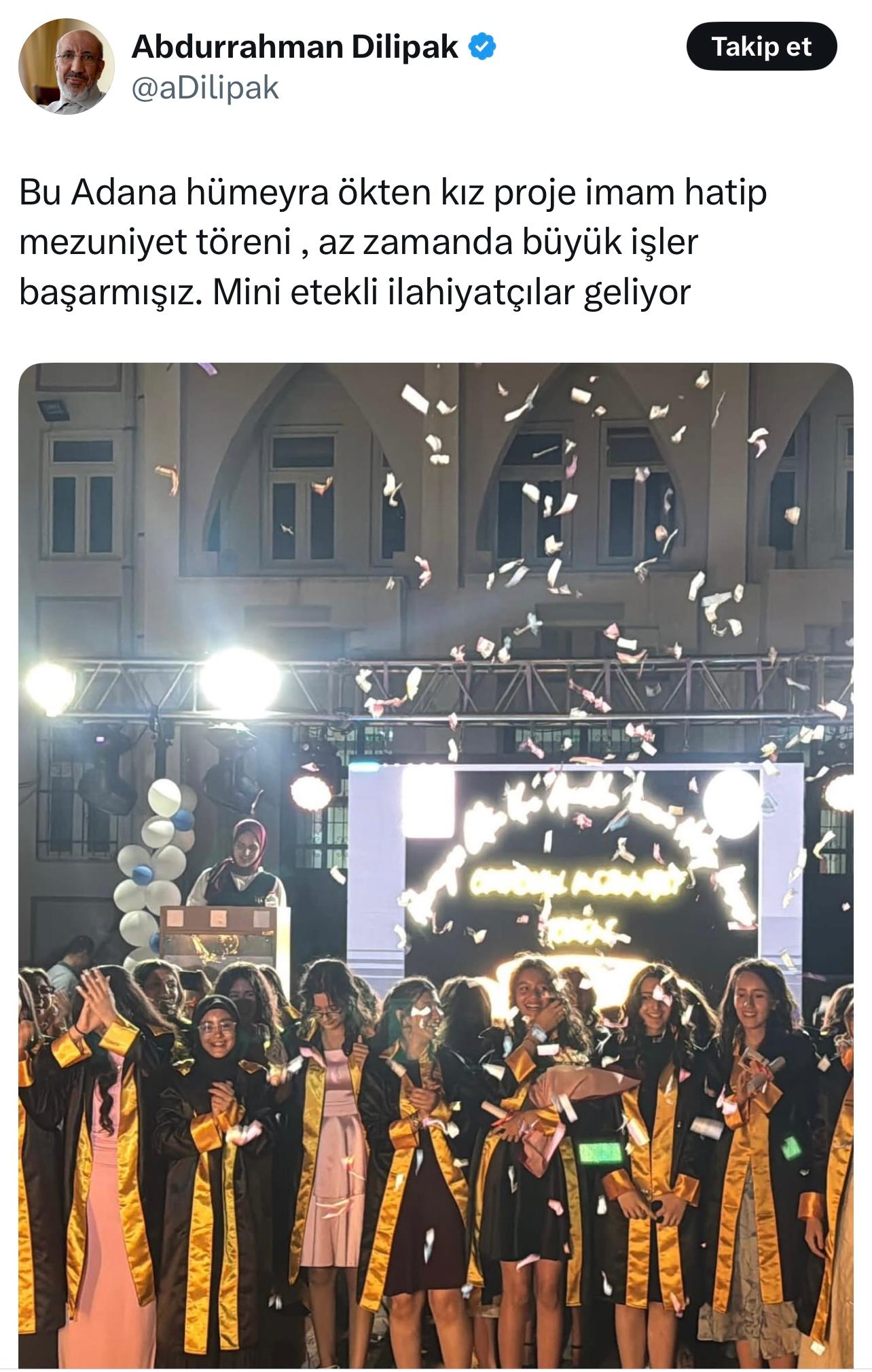 Hümeyra Ökten Kız İmam Hatip Lisesi mezuniyet töreninden bir fotoğraf paylaşan Abdurrahman Dilipak, mini etekli ilahiyatçıların olacağını iddia etti.