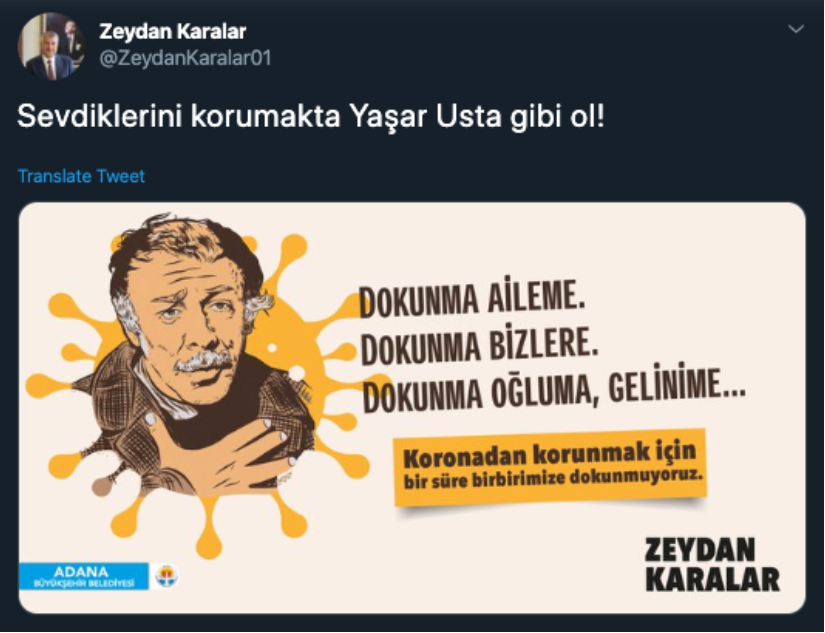 Adana Büyükşehir Belediye Başkanı Zeydan Karalar Twitter'da paylaştığı bir mesajla "Koronadan korunmak için bir süre birbirimize dokunmuyoruz" uyarısında bulundu.