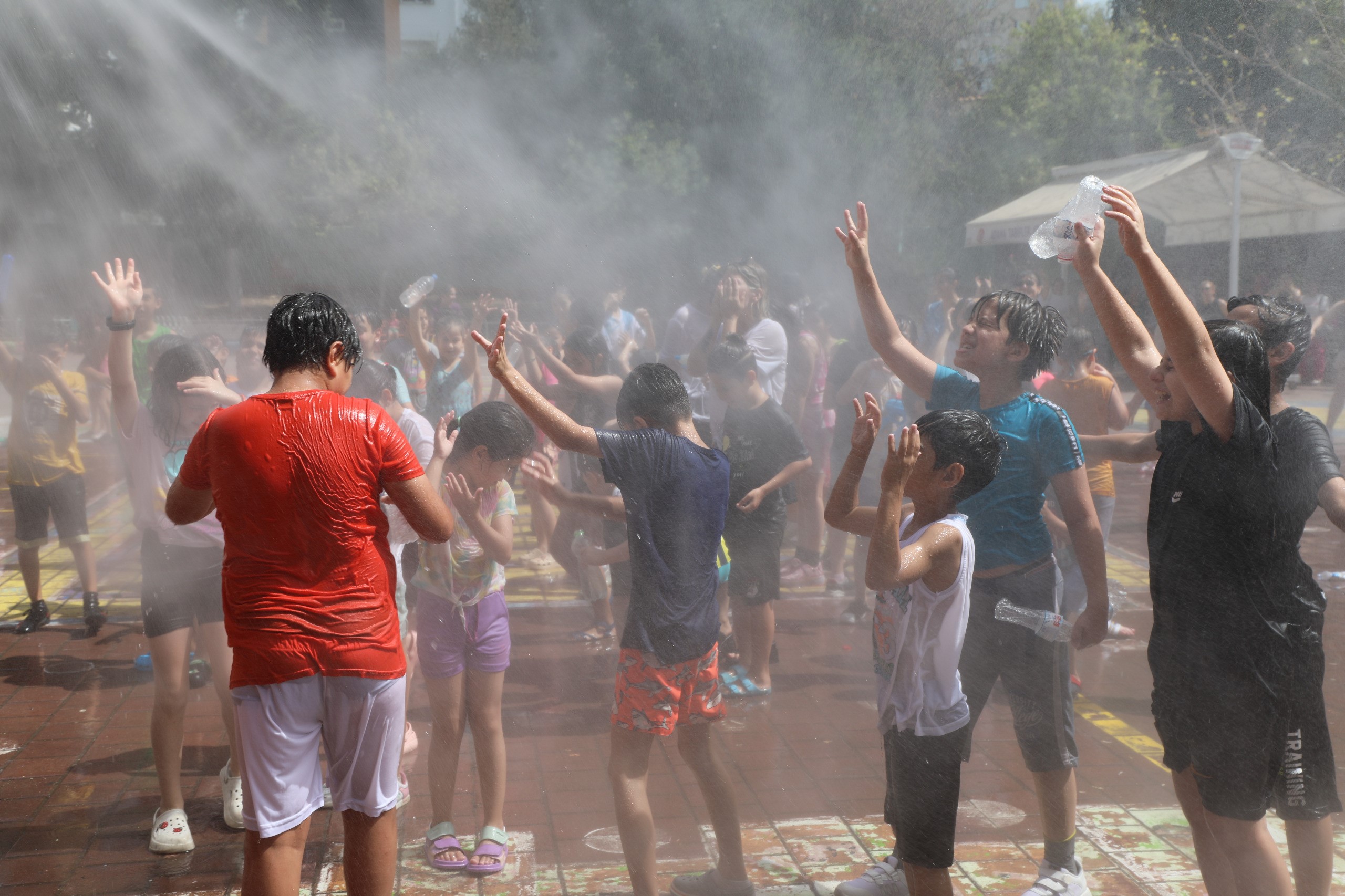 Adana Büyükşehir Belediyesi İtfaiye Ekipleri, karne heyecanı yaşayan çocukların sevincine ortak oldu, sıcaktan bunalan miniklere serinleten sürpriz yaptı.