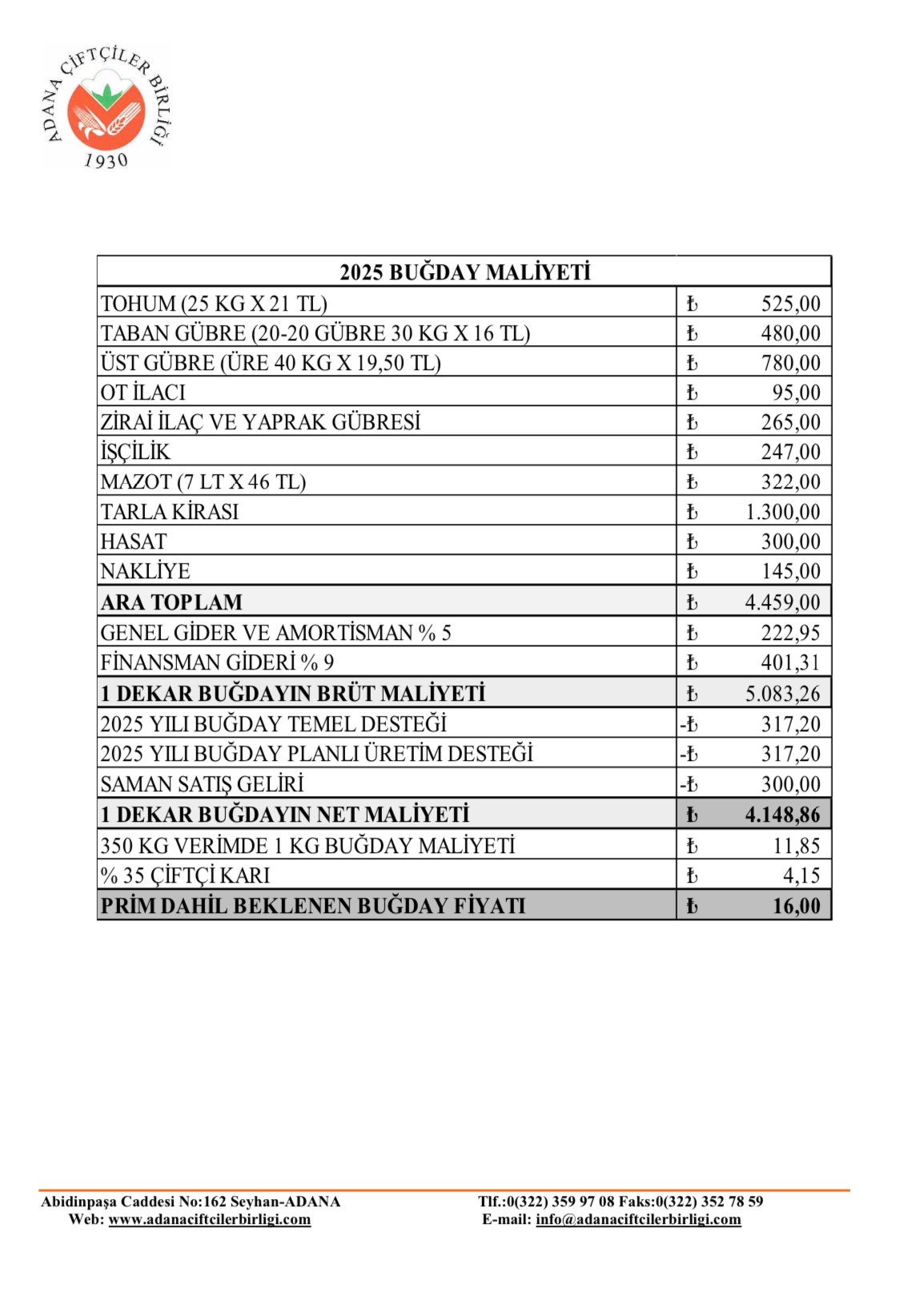 Bu yıl yaklaşık 7.3 milyon hektarda ekili olan buğdayda, iyimser tahminlere göre 18 milyon tonun biraz üzerinde rekolte olması beklenirken ithal buğdayın da Türkiye’ye maliyeti 335 doları, yani 12.90 TL’yi bulmaktadır. Şu anda erken biçilen buğdaylar piyasada peşin 13 TL/Kg’dan alıcı bulurken, biçim hızlanıp, rekoltenin düşük çıkmasıyla piyasada yükselme beklentisi de vardır. Bu yıl çiftçilerimizle yapılan görüşmeler ve piyasalardan topladığımız bilgiler ışığında hazırladığımız buğday maliyeti ve çiftçimizin fiyat beklentisini aşağıdaki tabloyla sunarken, piyasaların bir süre izlenerek gerek görüldüğünde açıklanacak müdahale alım fiyatı ile birlikte;