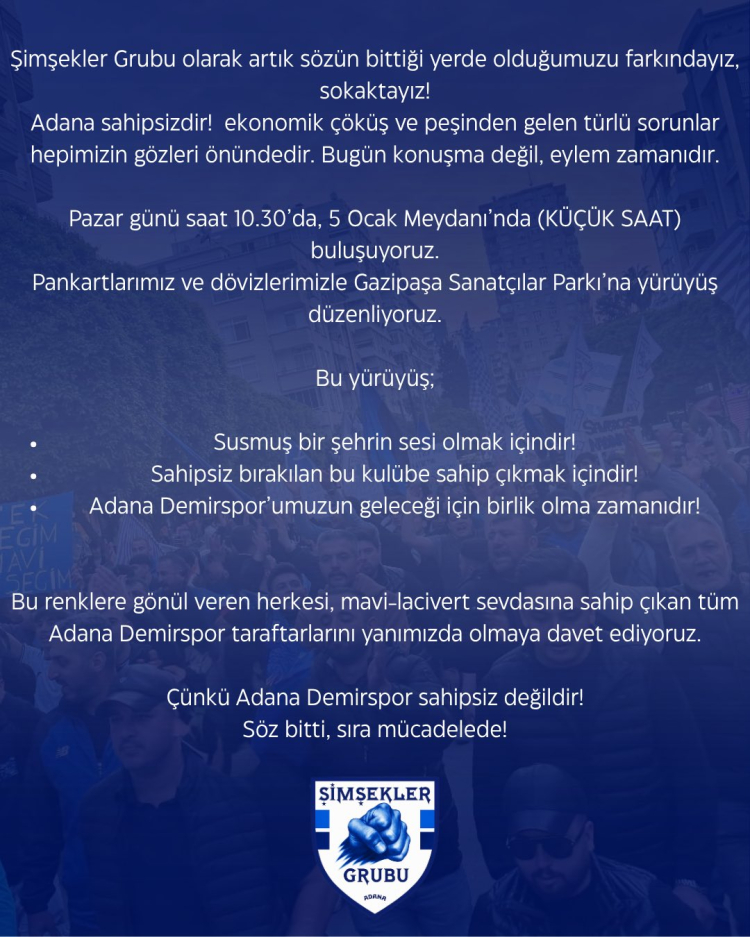 Yapılan açıklamada, “Adana sahipsizdir! Ekonomik çöküş ve peş peşe gelen sorunlar gözlerimizin önündedir. Bugün konuşma değil, eylem zamanıdır. Bu yürüyüş; susmuş bir şehrin sesi olmak, sahipsiz bırakılan bu kulübe sahip çıkmak ve Adana Demirspor’un geleceği için birlik olmak içindir. Bu renklere gönül veren herkesi yanımızda görmek istiyoruz” ifadelerini kullandı.