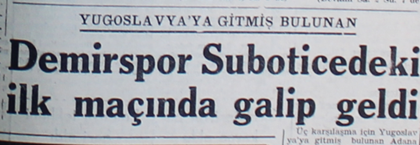 Takımımız 16 Nisan günü ilk maçını yapmak için şuan Sırbistan sınırları içinde bulunan Subotica şehrine ulaştı ve oteline yerleşti. Altı günlük yolun üstüne hemen ertesi gün ilk maçını yapmak için sahada ki yerini aldı. İlk maçı Subotica şehrinin ‘Spartak’ takımı ile oynayacaktı. Oynayacaktı ama hem yorgunluk hem de sahanın yağmurdan dolayı ıslak ve kaygan olması takımı bir hayli zorlayacaktı. Öyle de oldu.. İlk yarıyı 3-0 geride kapatan takımımız ikinci devrenin başlarında Selami Tekkazancı (Füze)’nın ayağında bulduğu golle umutlansa da zemin şartları ve kaleci hatalarından dolayı maçı 6-1 gibi bir skorla kaybetti. Nisan ayında güneşte kavrulmaya alışık Adana çocukları Yugoslavya’nın sert havası ve sert oyun ile karşılaşınca fark kaçınılmaz oldu. Bu sonuçtan sonra pes mi ettiler? Asla! Bir günlük dinlenmenin ardından ikinci maç için Niş şehrine geçtiler. Farklı mağlubiyetin etkisini üzerinden çabuk atan takım Niş şehrinin karma takımı ile yaptığı maçta; oyuna hızlı başlayarak ilk devrenin başlarında Füze Selami’nin kaydettiği iki gol ile öne geçti. Ardından aleyhine çalınan iki penaltı ile durum eşitlendi. İkinci yarı iyi bir oyunla Selami ve Ayhan’ın ayağından 3 gol bulan takımımız maçı 5-2 galip tamamladı. Takımın Avrupa’da galip gelmesi Adana’da da adeta gündem olmuş, halk arasında büyük sevinçle karşılanmıştı.
