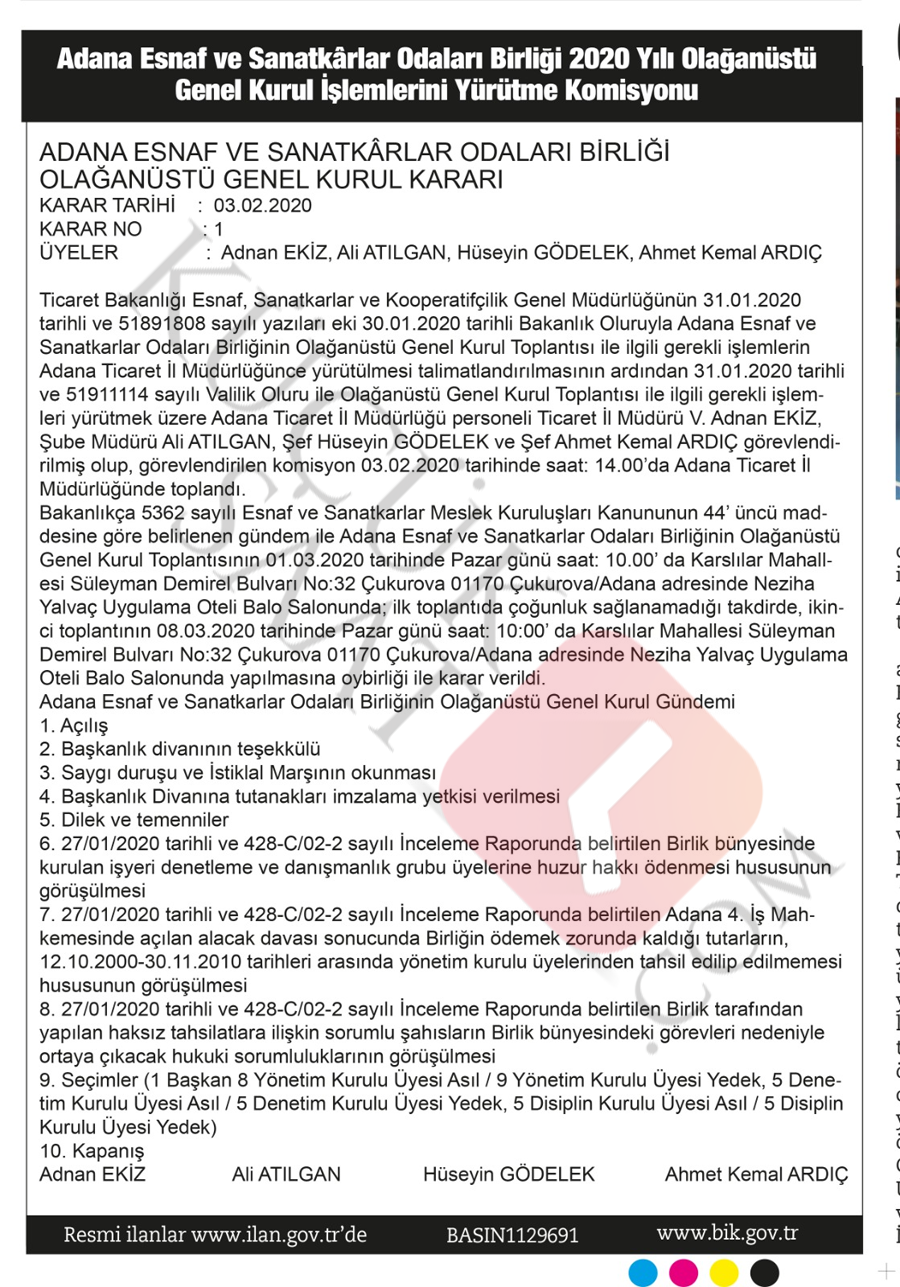 Adana Ticaret ve Sanayi İl Müdürü Adnan Ekiz koordinasyonunda 4 kişilik ekibin yöneteceği olağanüstü genel kurulun gündemi belli oldu. 10 maddelik genel kurul kararında altı, yedi ve sekizinci maddeler dikkat çekti. İlgili maddelerin detaylarında Adana ESOB’un mevcut yönetiminde herhangi bir yolsuzluğa rastlanılmadı.