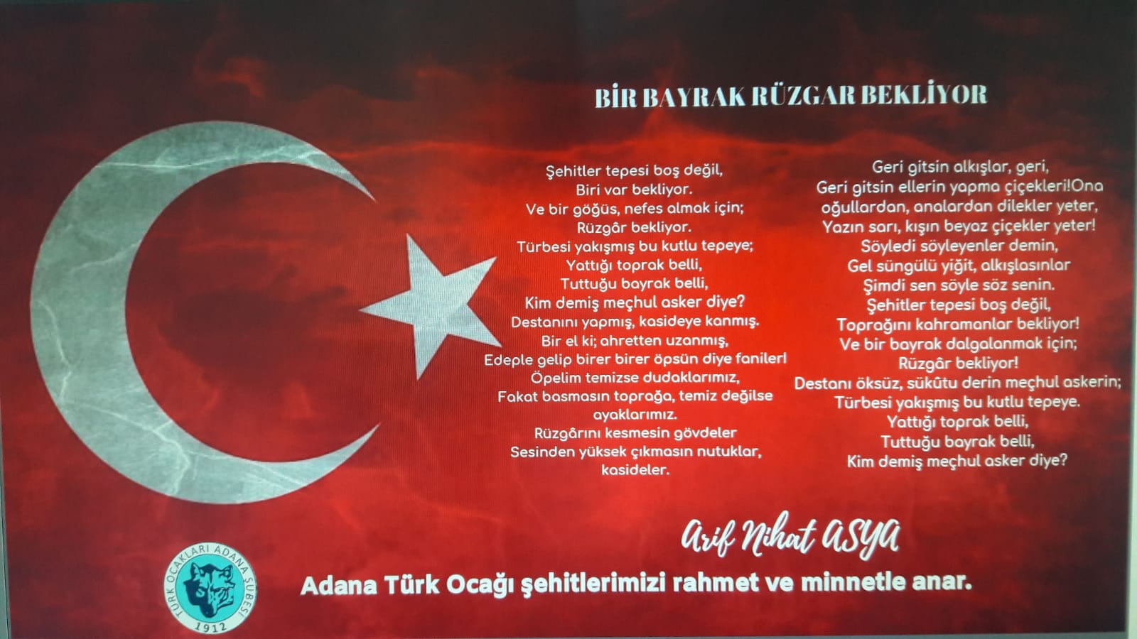 Türk Ocakları Adana Şube Yönetimi adına Şube Başkanı Ömer Volkan ÇİÇEK, İdlib'de yaşanan hain saldırı sonucu şehit olan askerlerimizi anmak ve taziyelerini sunmak adına Vali Mahmut DEMİRTAŞ'a Arif Nihat Asya'nın "Bir Bayrak Rüzgâr Bekliyor" adlı şiirinin yer aldığı bir tablo hediye etti.