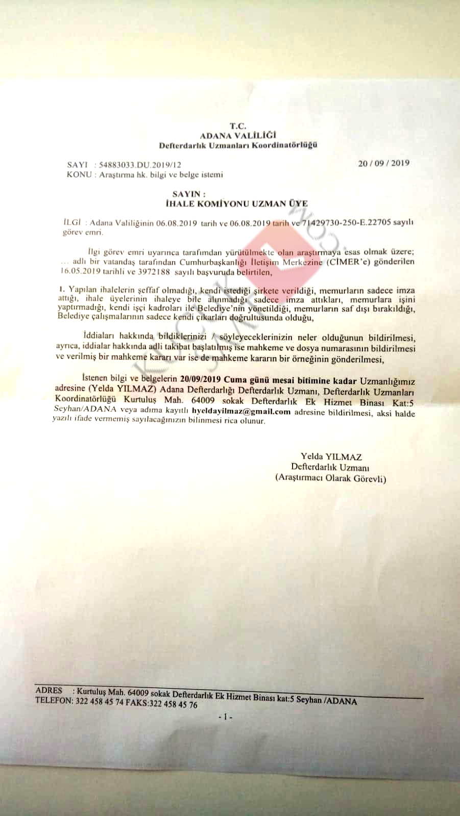 Adana Valiliği'nden Tufanbeyli Belediyesi ihale komisyonu ilgili uzman üyesine gönderilen yazıda, "Yapılan iddiaların şeffaf olmadığı, kendi istediği şirketlere verildiği, memurların sadece imza attığı, ihale üyelerinin ihaleye bile alınmadan sadece imza attığı, memurlara işini yaptırmadığı, kendi işçi kadroları belediyenin yönetildiği, memurların saf dışı bırakıldığı, belediye çalışmalarının sadece kendi çıkarları doğrultusunda olduğu" iddialarına bilgi ve belgelerle cevap istenildi.