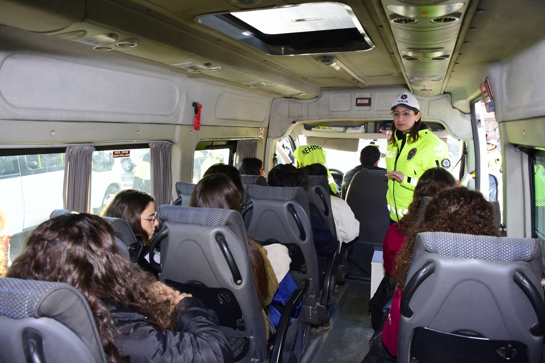 Ayrıca, araç içerisinde bulunan öğrencilere emniyet kemerinin önemi ve güvenli bir taşıma hizmeti için uyulması gereken kurallar anlatıldı.