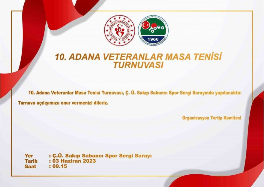 Geleneksel olarak yapılan Adana Veteranlar Masa Tenisi Turnuvasının Türkiye'nin geniş katılımlı önemli organizasyonlarından birisi olduğunu belirten Turnuva Komitesi Başkanı Kemal Sağ, "Değerli sporseverler, Adana Veteranlar Masa Tenisi Turnuvası 3-4 Haziran 2023 tarihlerinde, ÇİLTAR MTİ Kulübü tarafından Gençlik ve Spor İl Müdürlüğü ve Çukurova Üniversitesi'nin katkısı ile Ç.Ü. Sakıp Sabancı Spor ve Sergi Sarayı'nda yapılacak. Türkiye'nin bir numaralı şehri Adana'da yıllardır hem ulusal, hem de uluslararası tanıtımına katkı sunan marka organizasyonlardan bir tanesi Veteranlar Masa Tenisi Turnuvası olmuştur. Tüm sporseverleri Cumartesi günü saat 9.15'te yapılacak açılış törenimize davet ediyoruz" dedi.
