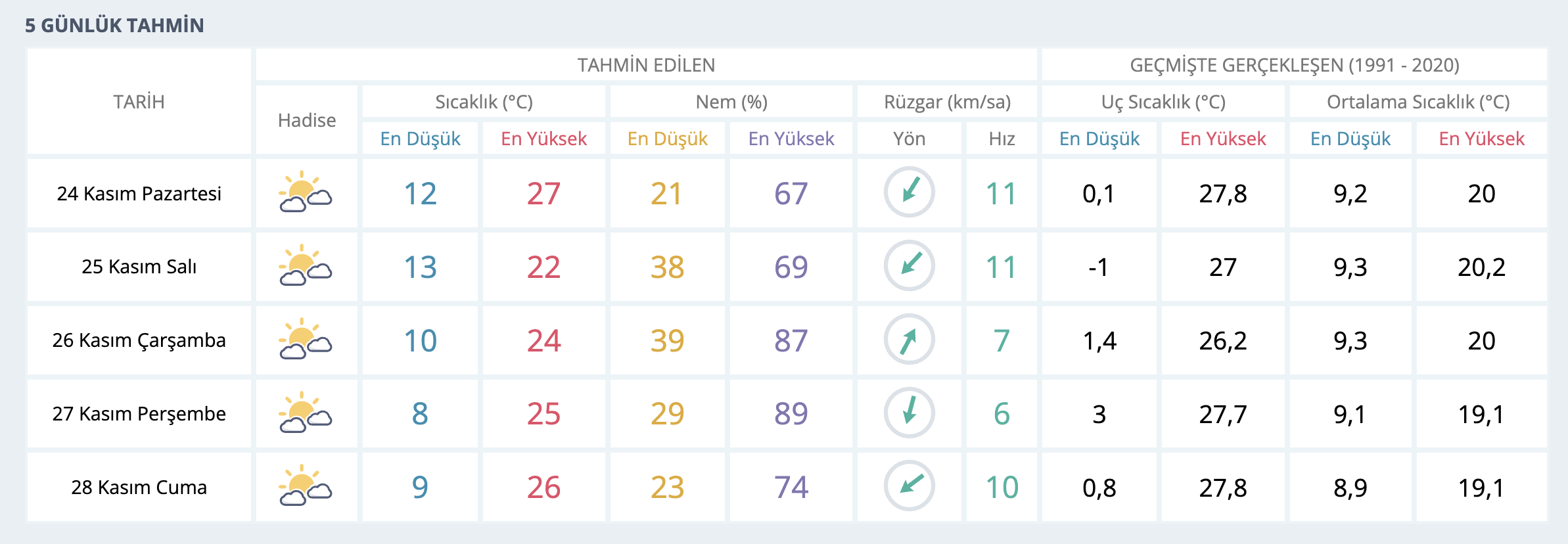 28 Kasım Cuma günü ise parçalı bulutlu hava devam ederken sıcaklık 9-26°C seviyelerine ulaşacak. Nem oranı yüzde 23-74 arasında olacak.