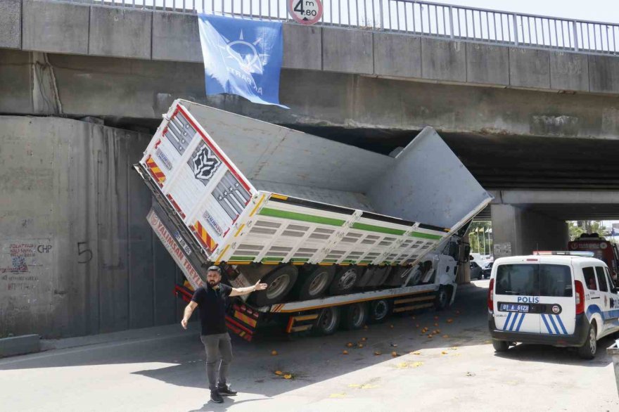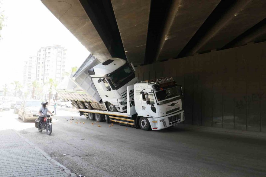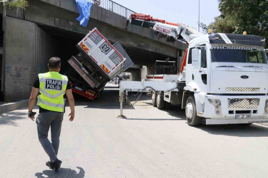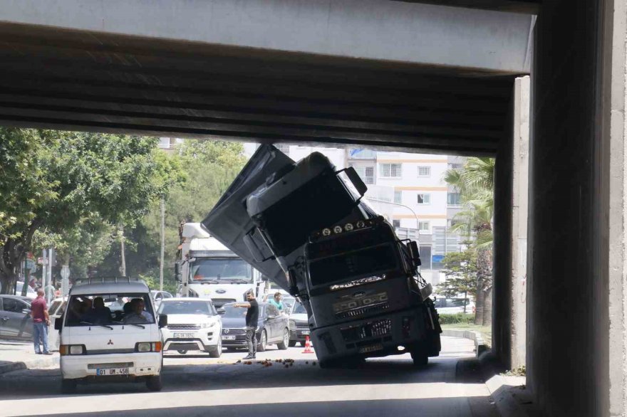 Adana'da çekicinin üzerindeki kamyon otoyol köprüsüne sıkışınca trafik felç oldu.