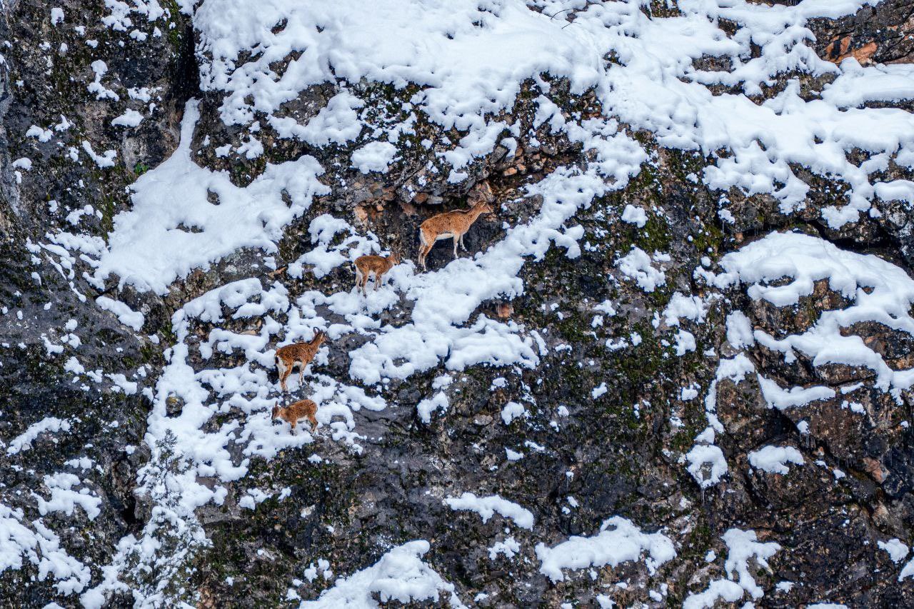 Dağ keçilerinin sürü halinde dolaşırken ki görüntüleri sosyal medyada paylaşıldı. Karların arasında dağ keçileri kartpostallık görüntüler oluşturdu.