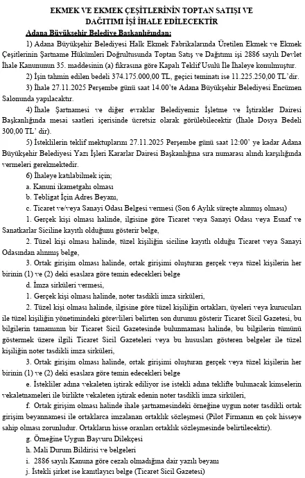 Belediye tarafından paylaşılan bilgilere göre, ihalenin tahmini bedeli 374 milyon 175 bin TL, geçici teminat bedeli ise 11 milyon 225 bin 250 TL olarak belirlendi. Yetkililer, bu ihalenin Adana’daki ekmek dağıtım sürecinde sektördeki güçlü firmalar için önemli bir iş fırsatı sunduğunu belirtti.