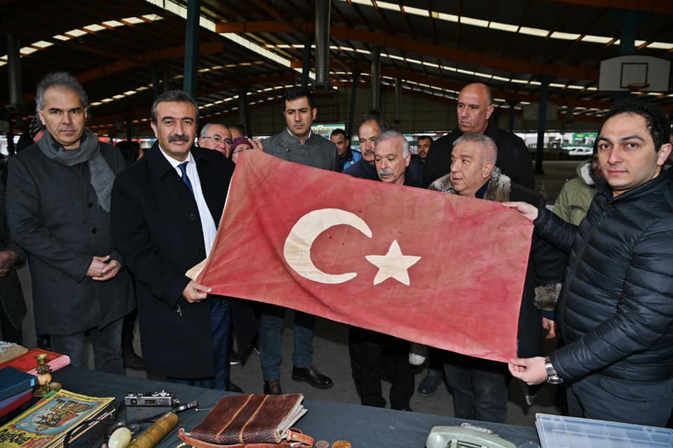 Pazar ziyareti sırasında Başkan Soner Çetin’e Kurtuluş Savaşı döneminde kadınların elle diktiği Türk Bayrağı ve Atatürk rozeti hediye edildi.