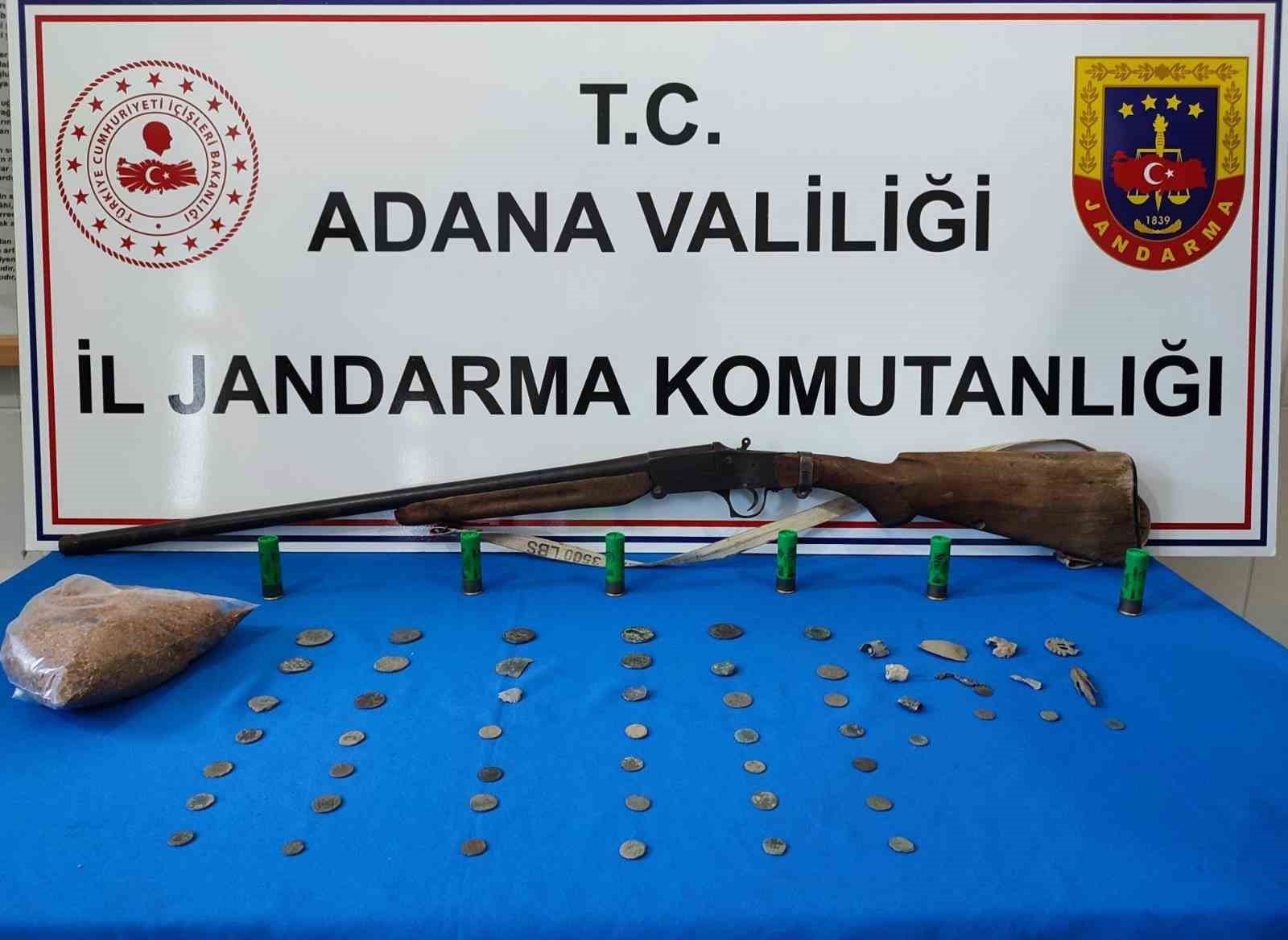 Adana İl Jandarma Komutanlığı ekiplerinden edinilen bilgiye göre, Pozantı ilçesinde icra edilen huzur ve güven uygulamaları çerçevesinde bir şahsın evinde yapılan aramada, Roma dönemine ait olduğu değerlendirilen 46 gümüş ve bronz sikke, 410 gram sentetik bonzai, 1 ruhsatsız av tüfeği ve 9 tarihi nitelik taşıdığı değerlendirilen şekilli obje ele geçirildi.
