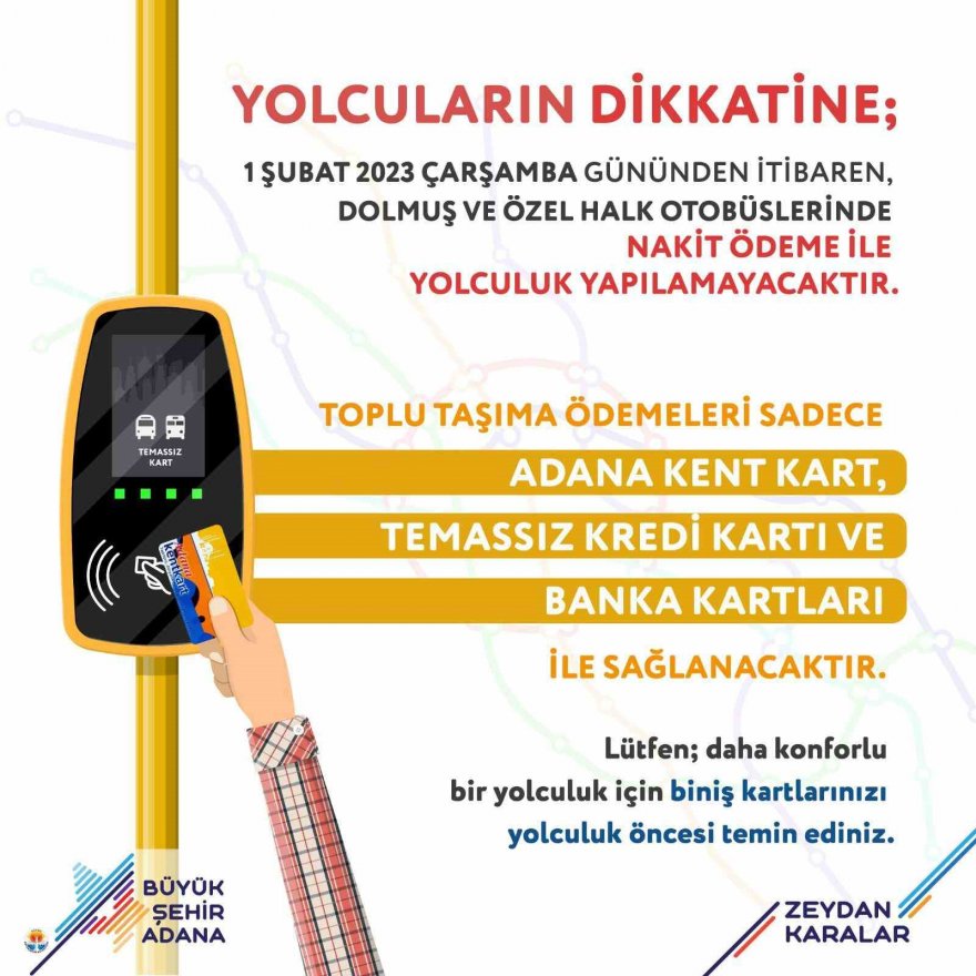 Yapılan açıklamada:"1 Şubat 2023 tarihinden itibaren dolmuş ve özel halk otobüslerinde nakit ödemeyle yolculuk yapılamayacaktır. Ödemeler sadece Kent Kart, temassız kredi kartı ve banka kartı ile sağlanacaktır. Lütfen daha konforlu bir yolculuk için biniş kartlarınızı yolculuk öncesi temin ediniz"denildi.