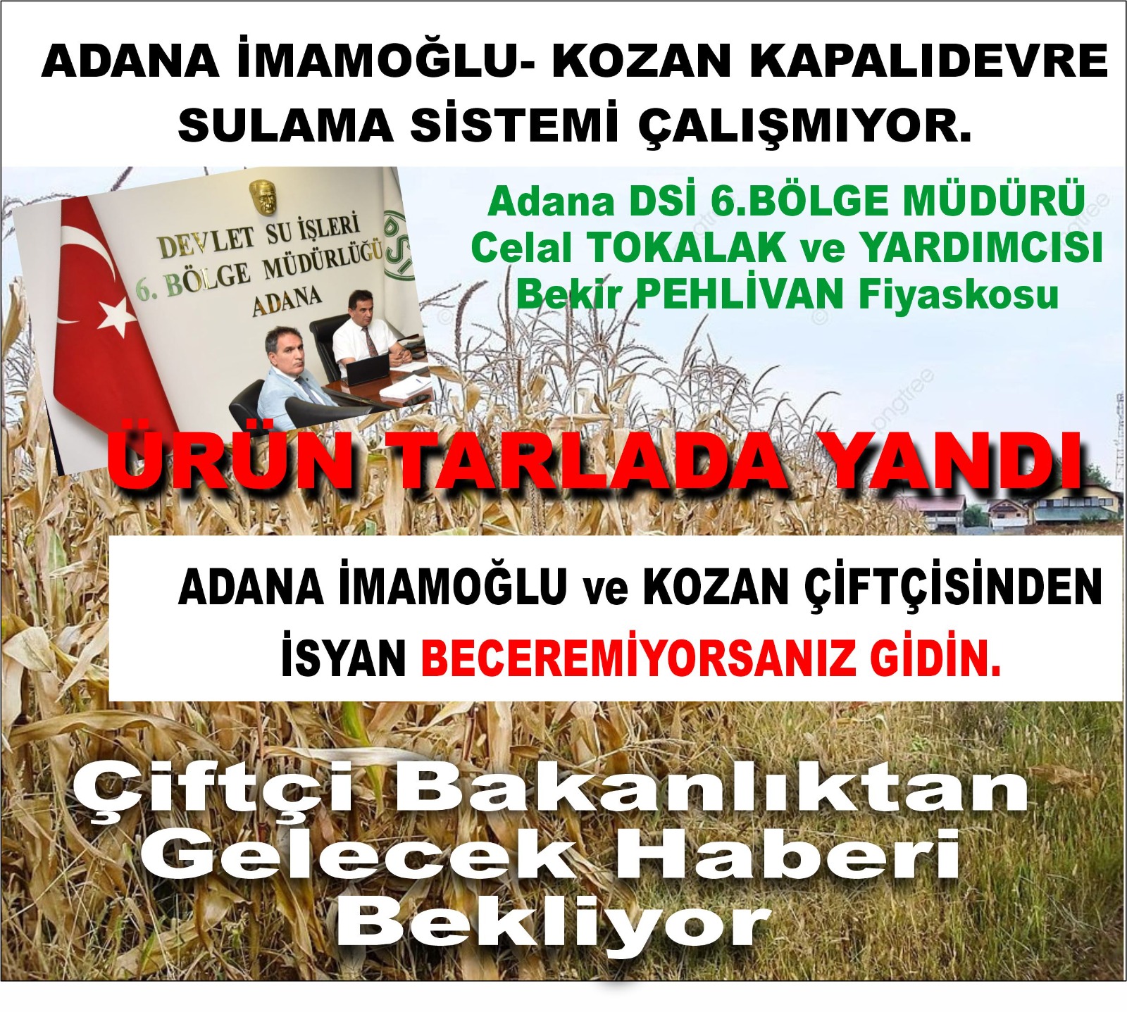Kucuksaat.com WhatsApp İhbar hattına gönderilen ihbarda, Adana İmamoğlu - Kozan kapalı devre sulama sisteminin çalışmaması nedeniyle tarlada sulanamayan mahsüllerin yandığı iddia edildi.