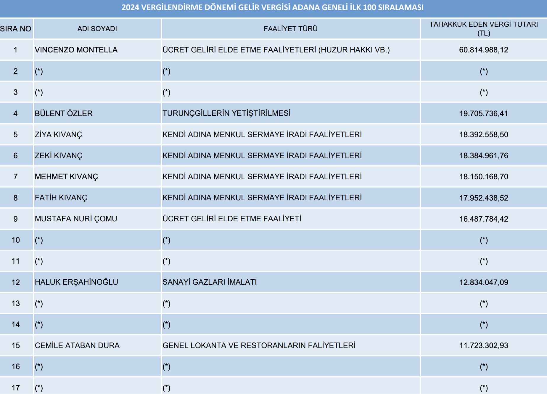 Adana'nın 2024 vergilendirme dönemi Gelir Vergisi rekortmeni, futbol camiasının yakından tanıdığı bir isim oldu. Vincenzo Montella, 60.814.988,12 TL tahakkuk eden vergi tutarıyla listenin ilk sırasında yer aldı. Montella'nın faaliyet türü, Ücret Geliri Elde Etme Faaliyetleri (Huzur Hakkı vb.) olarak belirtildi.