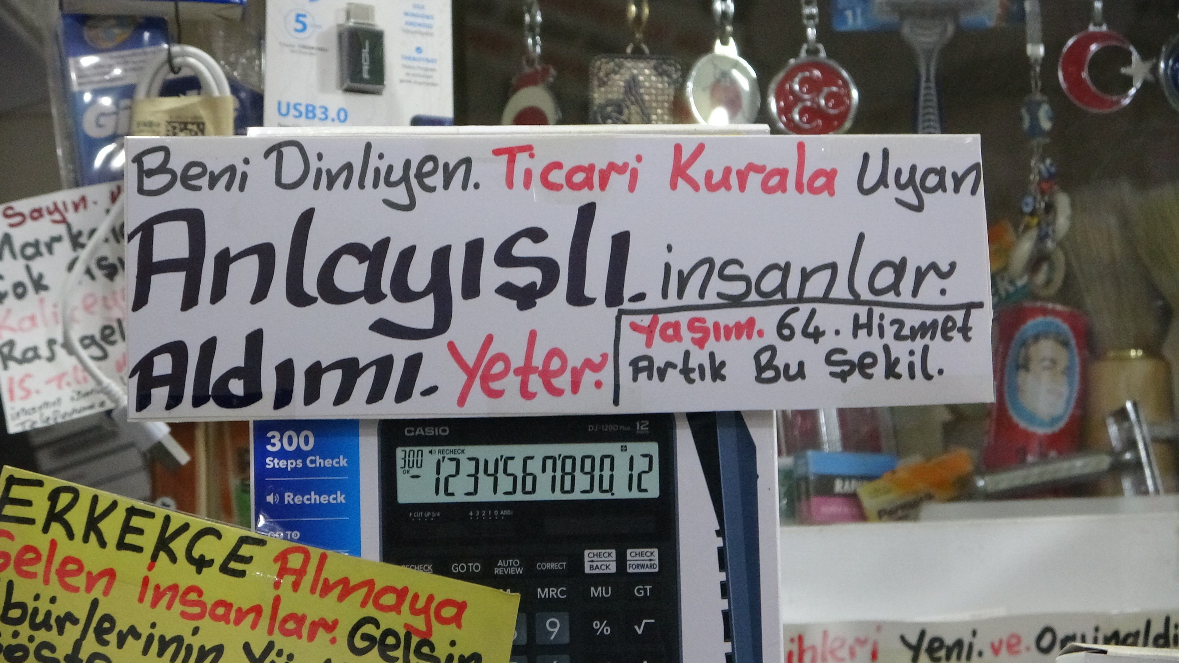 "Beni dinleyen ticari kurala uyan anlayışlı insanlar aldı mı yeter. Yaşım 64 hizmet artık bu şekil", "Kıl müşteriler benimle konuşmasınlar. Onlar kendini bilir. Efendilerin alışverişi bana yeter", "İşim acele ver şunu diyenler gelmesinler.