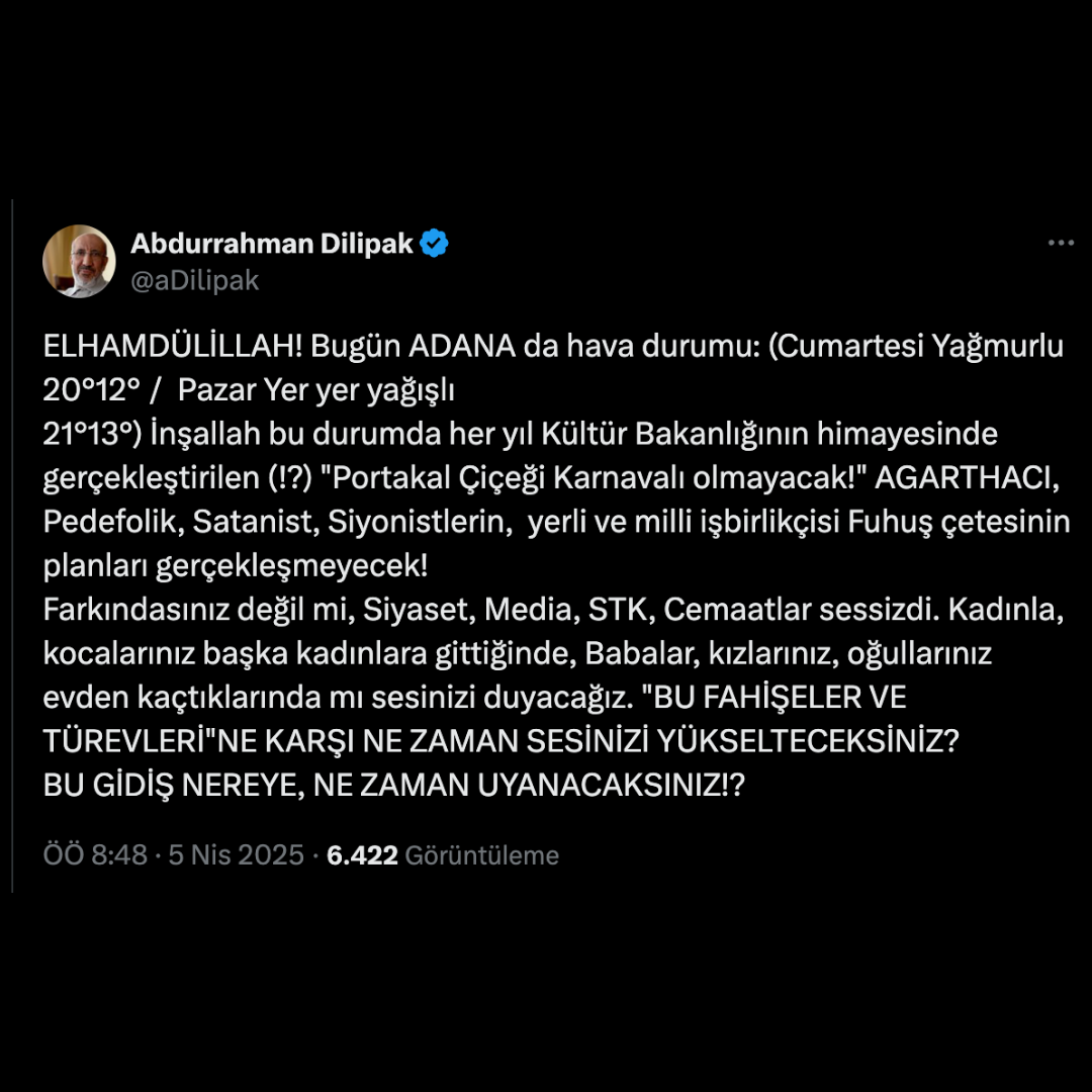 Kendisi de Adanalı olan Gazeteci/ Yazar Abdurrahman Dilipak, Adana’da gerçekleştirilen “Portakal Çiçeği Karnavalı” hakkında akıl sınırlarını zorlayan paylaşımların bulunduktan sonra, hakaret içeren ifadeler kullanmaktan da çekinmedi.