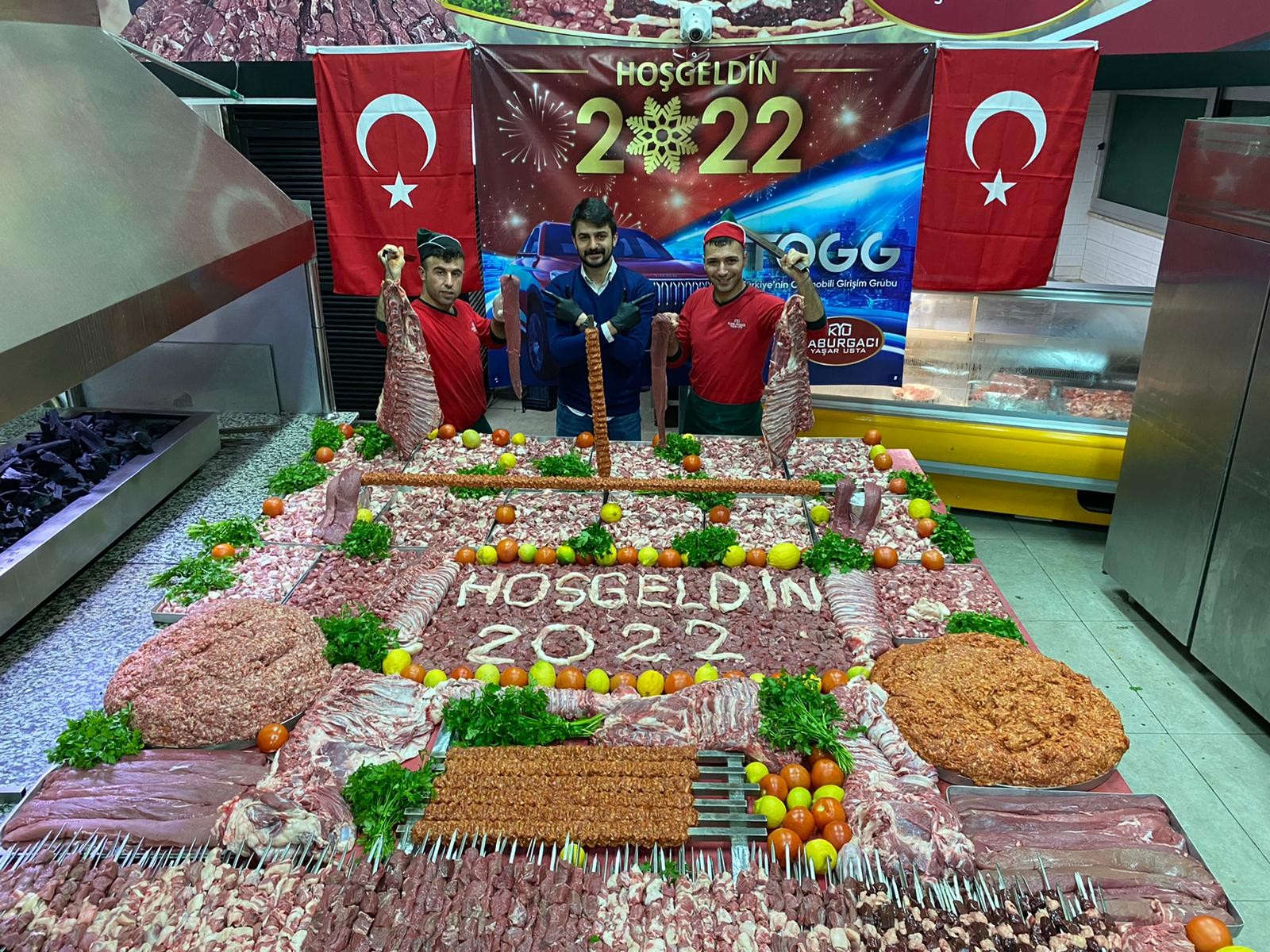 dana’da bir kebapçı yeni yılı yerli otomobilin seri üretime geçmesi planlanan 2022 yılına atıfta bulunarak 'Hoş geldin 2022' yazılı et ve pankartlarla karşılıyor.
