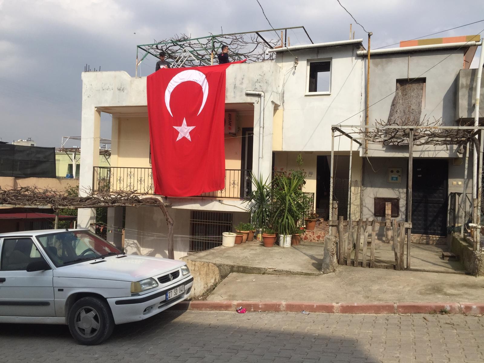 Tek katlı eve gelen zabıtalar, binaya Türk bayrağı astı.