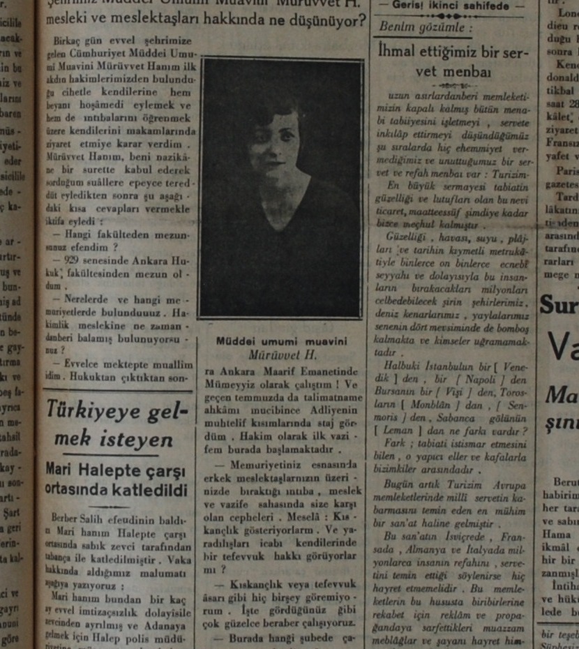 "Cumhuriyet Müddei Umumisi Muavini (Cumhuriyet Savcı Yardımcısı) Mürüvvet Hanım, beni nazikane bir surette kabul ederek sorduğum suallere epeyce tereddüt ettikten sonra kısa cevaplar vermekle yetindi: