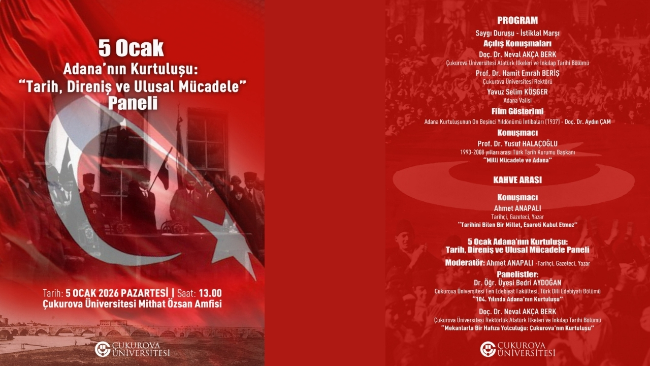 Çukurova Üniversitesi, Adana’nın düşman işgalinden kurtuluşunun 104. yıl dönümü kapsamında, “5 Ocak Adana’nın Kurtuluşu: Tarih, Direniş ve Ulusal Mücadele” başlıklı panele ev sahipliği yapacak.