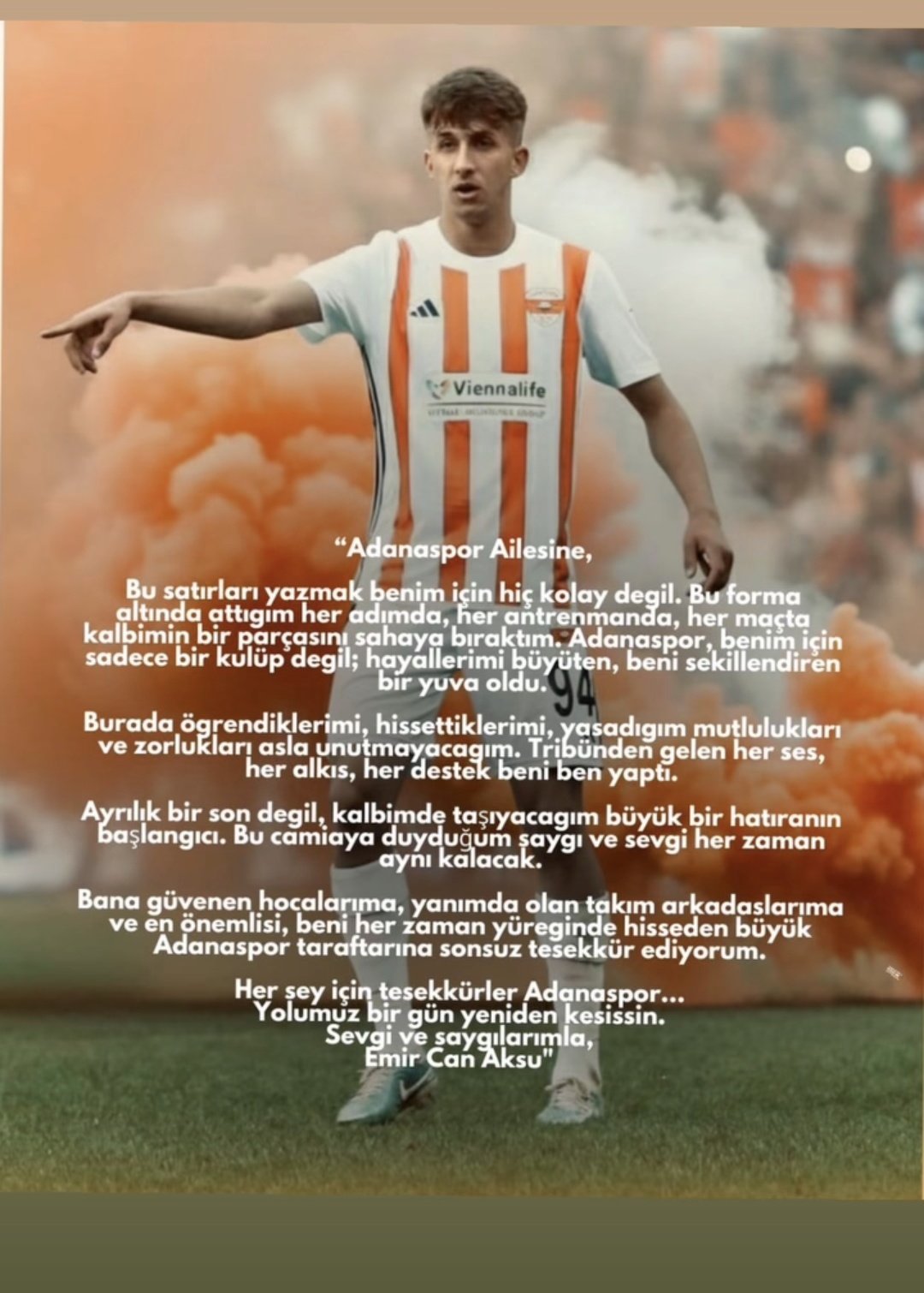 Turuncu-beyazlı formayı terleten genç oyuncu Emir Can Aksu, yayımladığı duygusal bir mektupla camiaya veda ettiğini duyurdu.Aksu, "Adanaspor Ailesine" başlığıyla kaleme aldığı veda mesajında, kulübün kendisi için bir takımdan öte "yuva" olduğunu vurguladı.