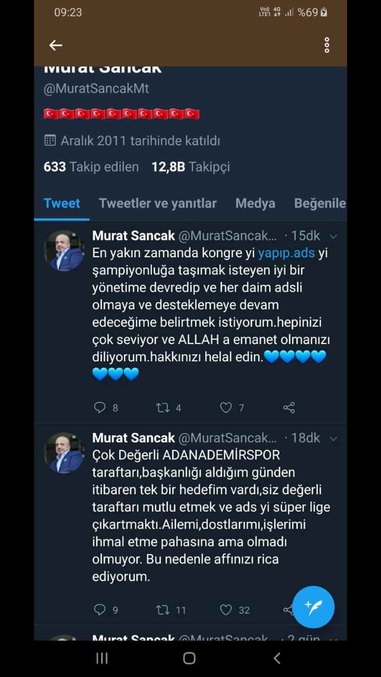 “Çok Değerli ADANADEMİRSPOR taraftarı,başkanlığı aldığım günden itibaren tek bir hedefim vardı,siz değerli taraftarı mutlu etmek ve ads yi süper lige çıkartmaktı.Ailemi,dostlarımı,işlerimi ihmal etme pahasına ama olmadı olmuyor. Bu nedenle affınızı rica ediyorum.En yakın zamanda kongre yi yapıp.ads yi şampiyonluğa taşımak isteyen iyi bir yönetime devredip ve her daim adsli olmaya ve desteklemeye devam edeceğime belirtmek istiyorum.hepinizi çok seviyor ve ALLAH a emanet olmanızı diliyorum.hakkınızı helal edin” açıklamalarına yer vererek kararını duyurdu.