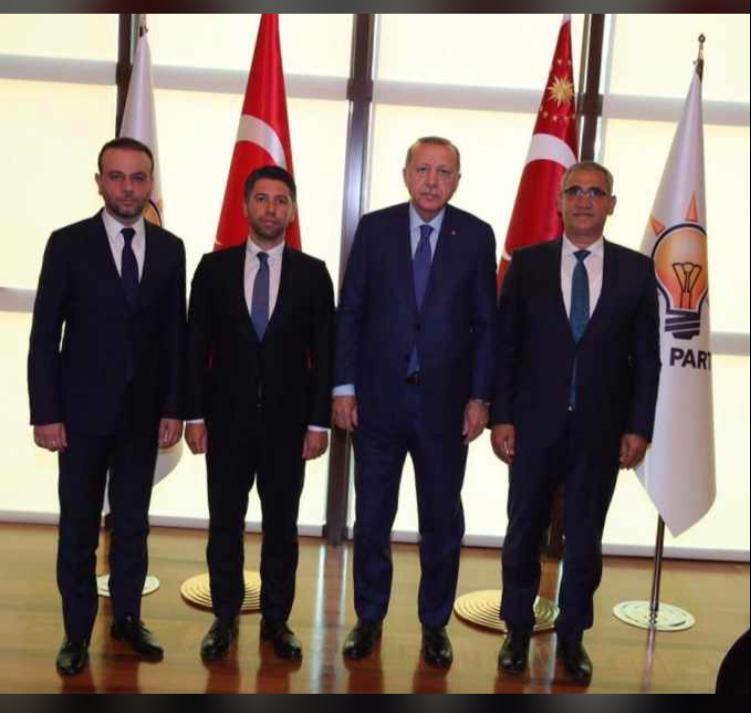 İl Başkanlığı için çağrılan Ozan Gülaçtı, Kasım Pamuk ve yeni il başkanı Mehmet Ay, Cumhurbaşkanı Erdoğan ile o anı ölümsüzleştirdi.