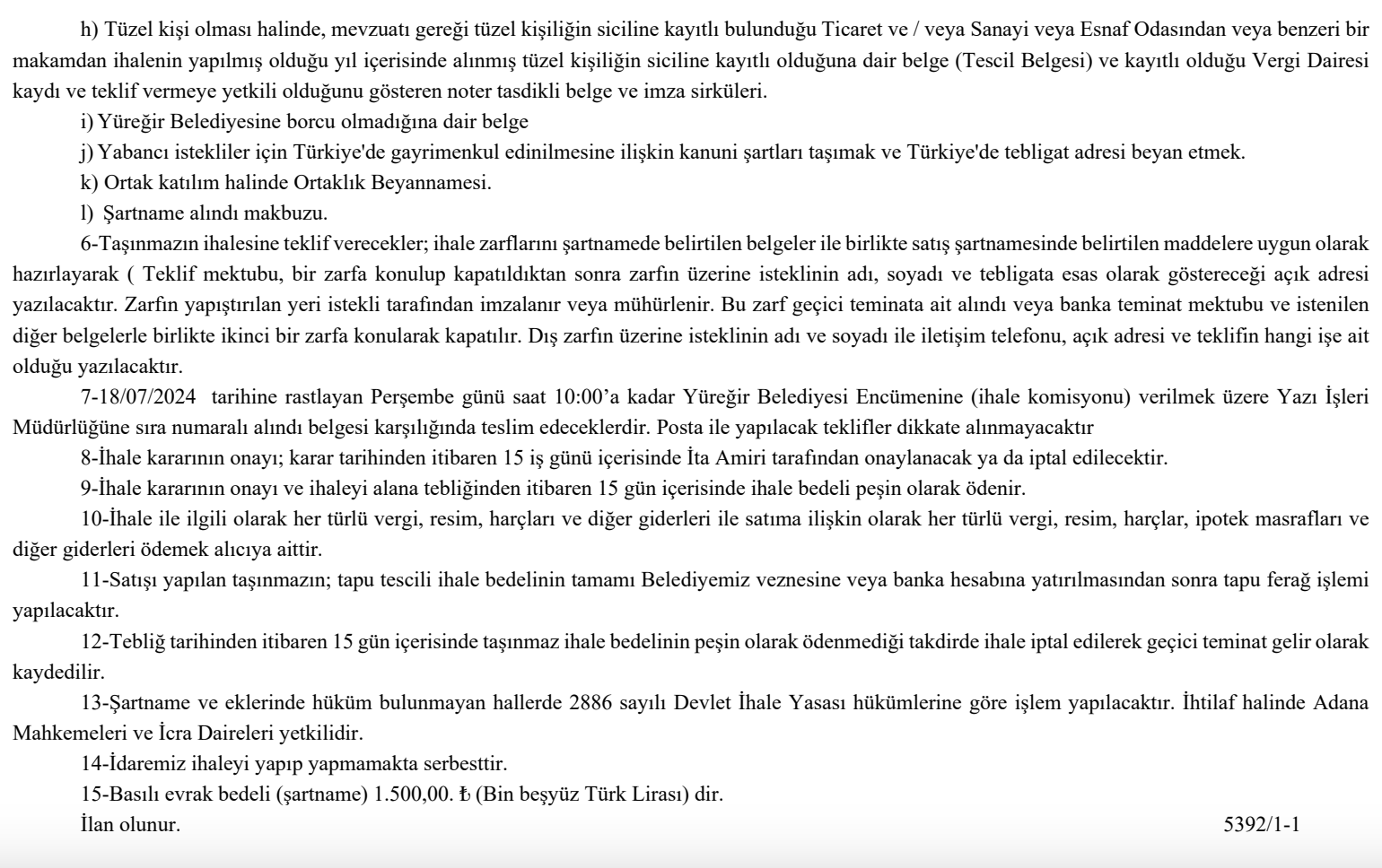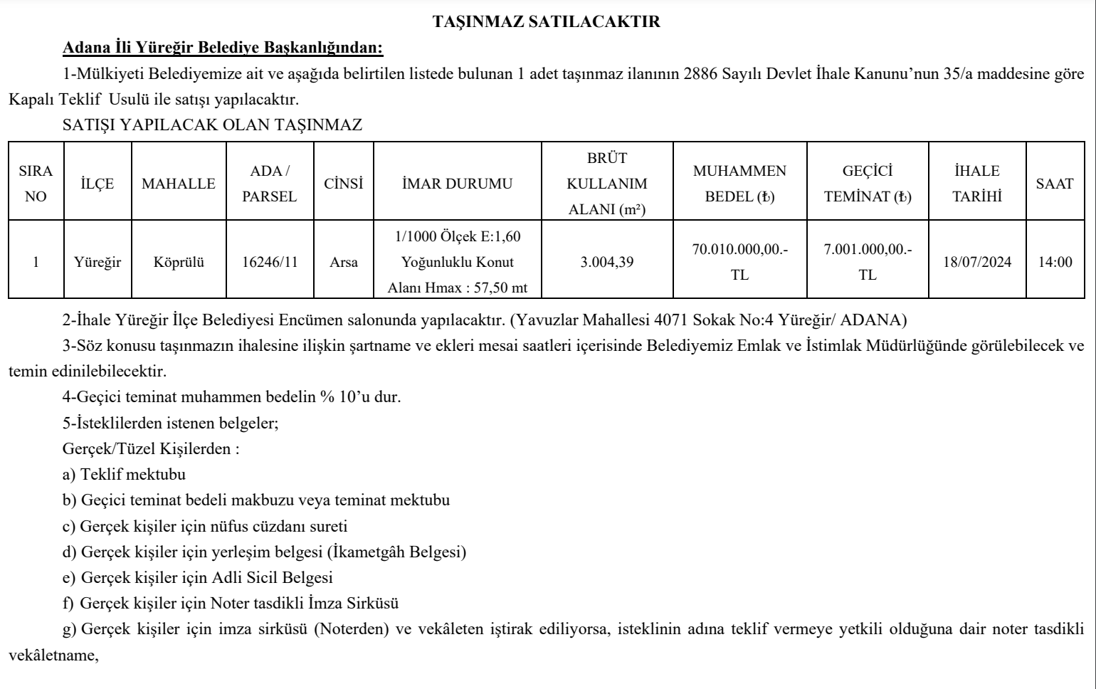 Yüreğir Belediyesi arsa satışı Resmi Gazete'de yayımlandı. İşte detaylar...