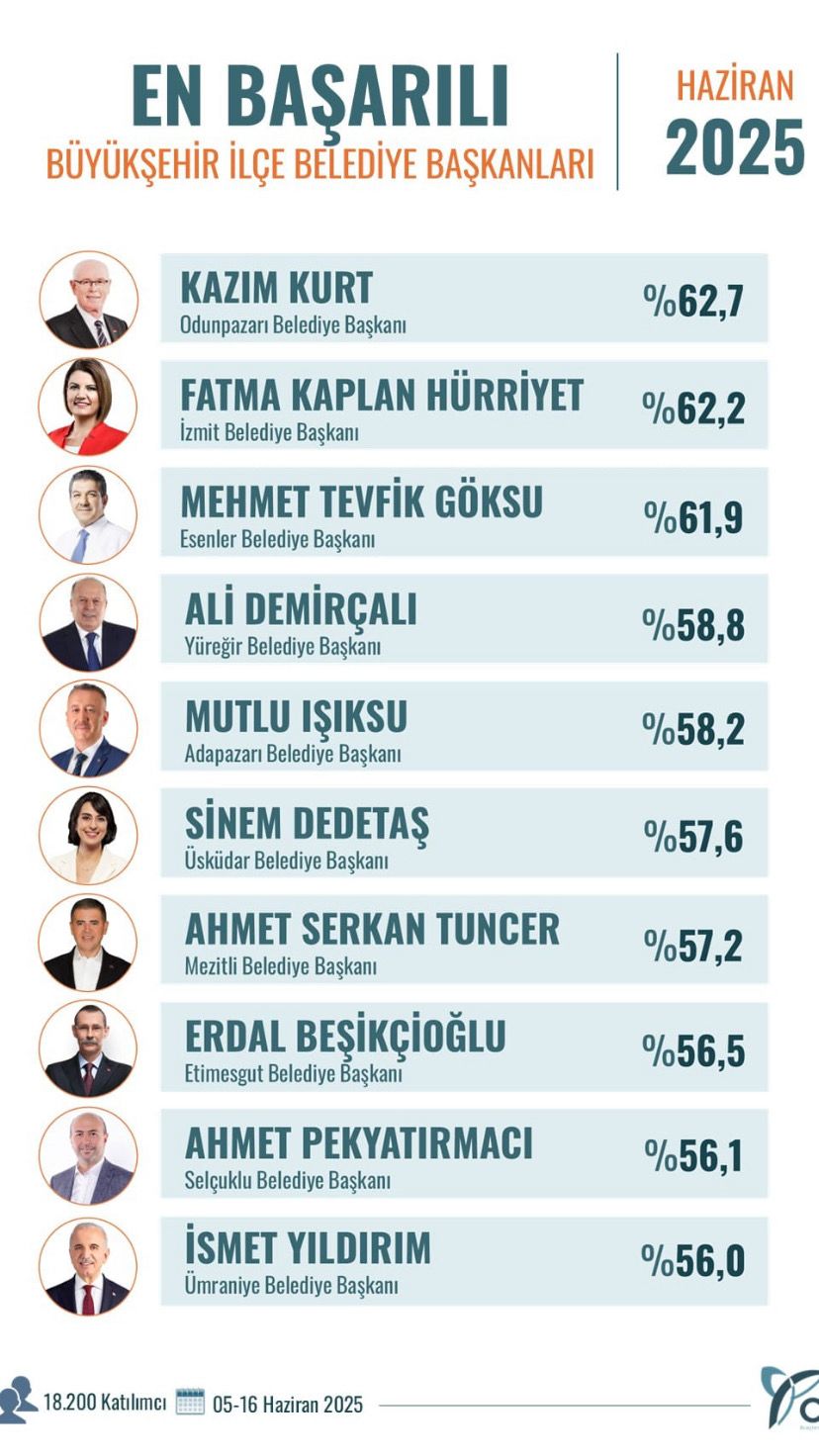 Yüreğir Belediye Başkanı Ali Demirçalı, ORC Araştırma Şirketi’nin 05-16 Haziran 2025 tarihleri arasında 18 bin 200 kişiyle yaptığı ankete göre en başarılı büyükşehir ilçe belediye başkanları arasında 4. oldu.