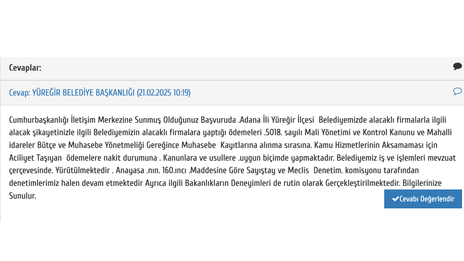 Cumhurbaşkanlığı İletişim Merkezine Sunmuş Olduğunuz Başvuruda .Adana İli Yüreğir İlçesi Belediyemizde alacaklı firmalarla ilgili alacak şikayetinizle ilgili Belediyemizin alacaklı firmalara yaptığı ödemeleri .5018. sayılı Mali Yönetimi ve Kontrol Kanunu ve Mahalli idareler Bütçe ve Muhasebe Yönetmeliği Gereğince Muhasebe Kayıtlarına alınma sırasına. Kamu Hizmetlerinin Aksamaması için Aciliyet Taşıyan ödemelere nakit durumuna . Kanunlara ve usullere .uygun biçimde yapmaktadır. Belediyemiz iş ve işlemleri mevzuat çerçevesinde. Yürütülmektedir. Anayasa .nin. 160.inci .Maddesine Göre Sayıştay ve Meclis Denetim. komisyonu tarafından denetimlerimiz halen devam etmektedir Ayrıca ilgili Bakanlıkların Deneyimleri de rutin olarak Gerçekleştirilmektedir. Bilgilerinize Sunulur.