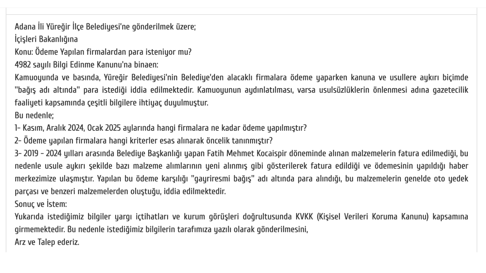Kamuoyunda ve basında, Yüreğir Belediyesi'nin Belediye'den alacaklı firmalara ödeme yaparken kanuna ve usullere aykırı biçimde "bağış adı altında" para istediği iddia edilmektedir. Kamuoyunun aydınlatılması, varsa usulsüzlüklerin önlenmesi adına gazetecilik faaliyeti kapsamında çeşitli bilgilere ihtiyaç duyulmuştur.