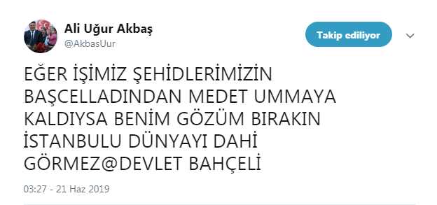 “EĞER İŞİMİZ ŞEHİDLERİMİZİN BAŞCELLADINDAN MEDET UMMAYA KALDIYSA BENİM GÖZÜM BIRAKIN İSTANBULU DÜNYAYI DAHİ GÖRMEZ @DEVLET BAHÇELİ”