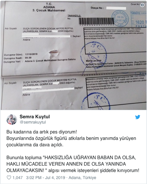 Twitter hesabından peş peşe paylaşımlarda bulunan Kuytul'un eşi Semra Kuytul, 2003 ve 2004 doğumlu kızları hakkında açılan davaya tepkisini şu sözlerle dile getirmişti: