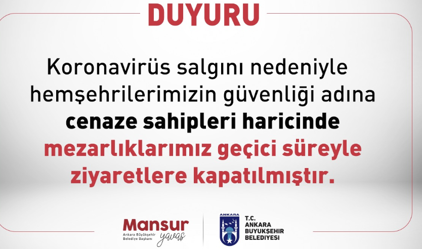 Ankara Büyükşehir Belediyesi :”Güvenliğiniz açısından, salgın tedbirleri kapsamında cenaze yakını haricinde tüm mezarlıklar geçici süreyle ziyarete kapatılmıştır”