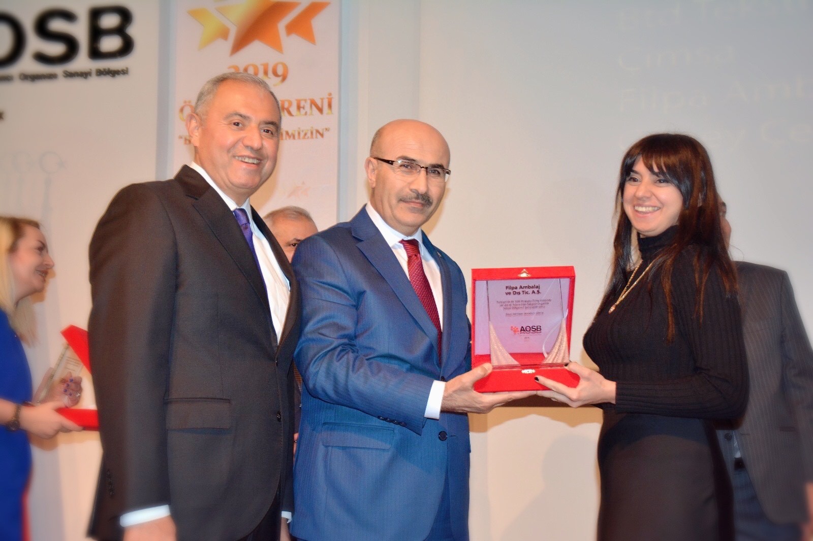 Türkiye İhracatçılar Meclisi’nin yapmış olduğu Türkiye’nin İlk 1000 İhracatçı Araştırmasında yer alan ve AOSB’de üretim yapan 8 firmanın temsilcisinin ödüllerini aldığı törende, Ankutsan, Amylum, Bossa, BTD Tekstil, Filpa Ambalaj, Güney Çelik Hasır, Kastamonu Entegre, Pilyem Gıda ’nın temsilcilerine ödül verildi.