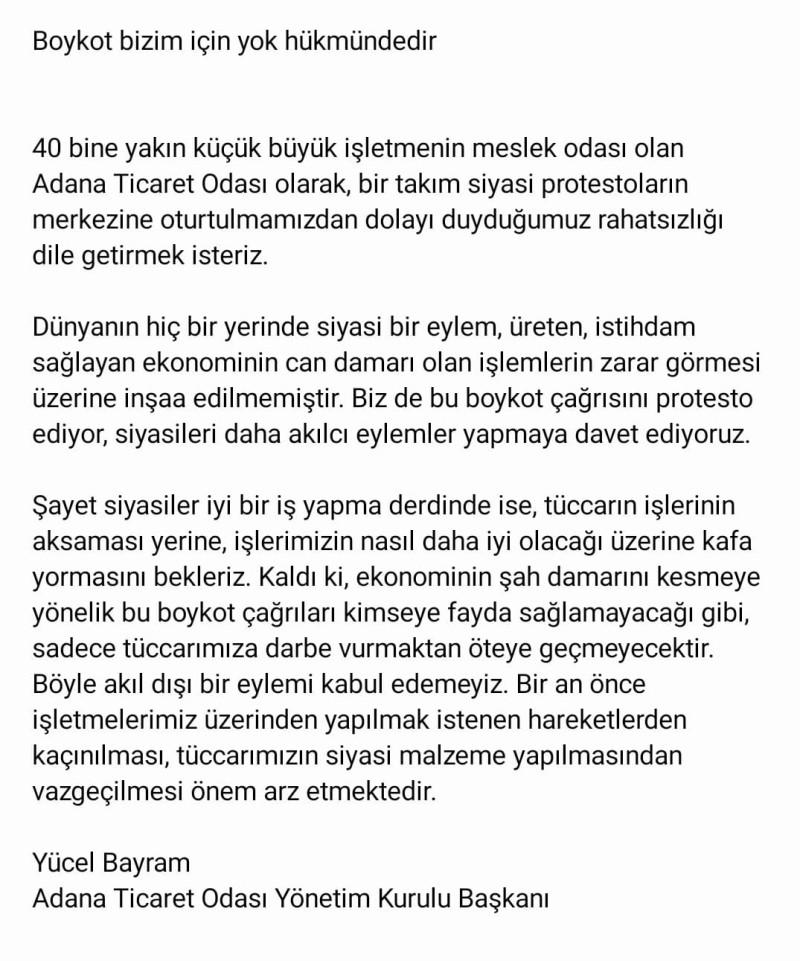 Boykota karşı Adana Ticaret Odası başkanı Yücel Bayram tepki göstererek “bizim için yok hükmündedir” dedi.