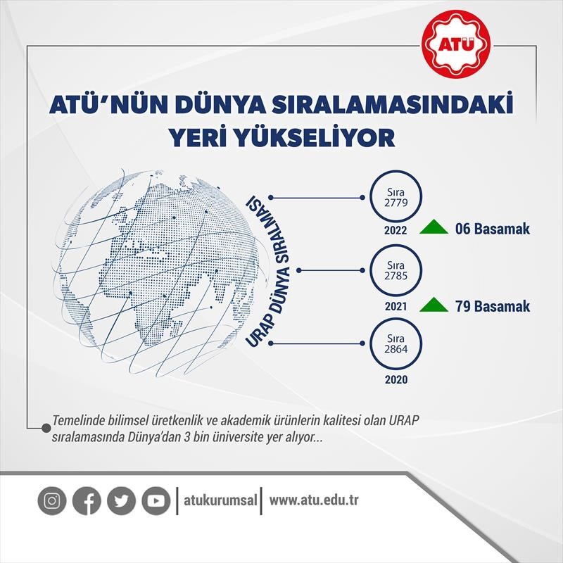 Önemli bilimsel ilerlemelerin kaydedildiği ATÜ, 2020 yılında 2 bin 864’üncü sıradan girdiği URAP Dünya Sıralaması Listesinde 2021 yılında 79 basamak, 2022 yılında ise 6 basamak olmak üzere toplamda 85 basamak yukarı çıkarak 2 bin 779’uncu sırada yer aldı.