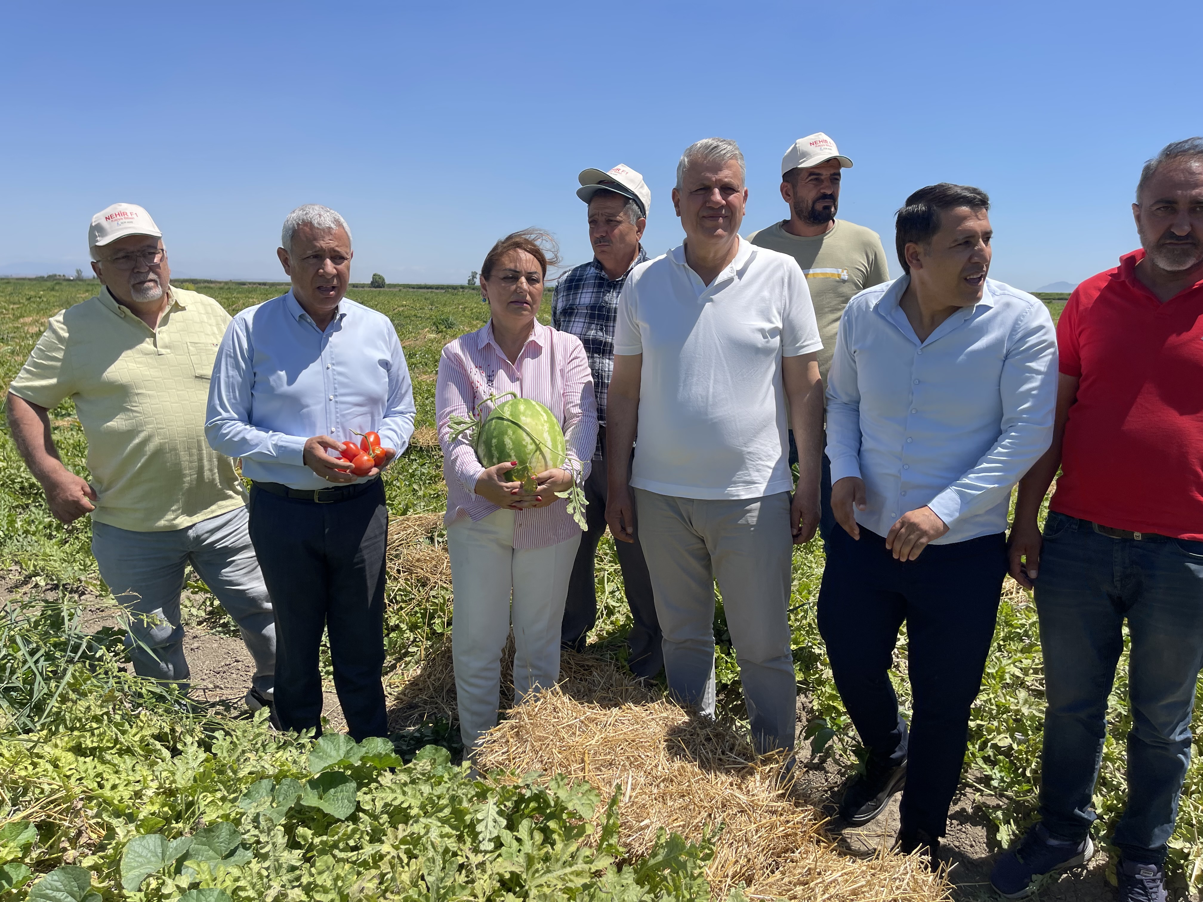 CHP Adana Milletvekilleri Ayhan Barut, Dr. Müzeyyen Şevkin ve Orhan Sümer, domates, biber ve karpuz gibi ürünleri para etmediği için tarlada kalan çiftçilerle buluştu, yürek yakan feryatlarını dinledi