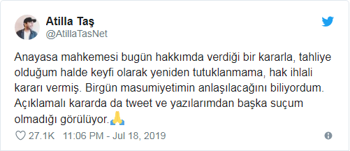 Anayasa Mahkemesi Atilla Taş hakkında hak ihlali kararı verdi. Kararı sosyal medya hesabından duyuran Atilla Taş, “Anayasa mahkemesi bugün hakkımda verdiği bir kararla, tahliye olduğum halde keyfi olarak yeniden tutuklanmama, hak ihlali kararı vermiş. Birgün masumiyetimin anlaşılacağını biliyordum. Açıklamalı kararda da tweet ve yazılarımdan başka suçum olmadığı görülüyor” dedi.