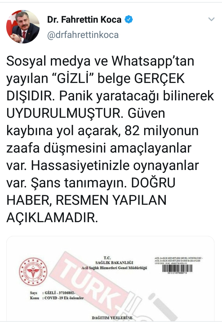 Sağlık Bakanı Fahrettin Koca o belgeyle ilgili vakit kaybedetmeden açıklamada bulundu. Bakan Koca, "Belge gerçek dışıdır. Doğru haber, resmen yapılan açıklamadır." dedi.